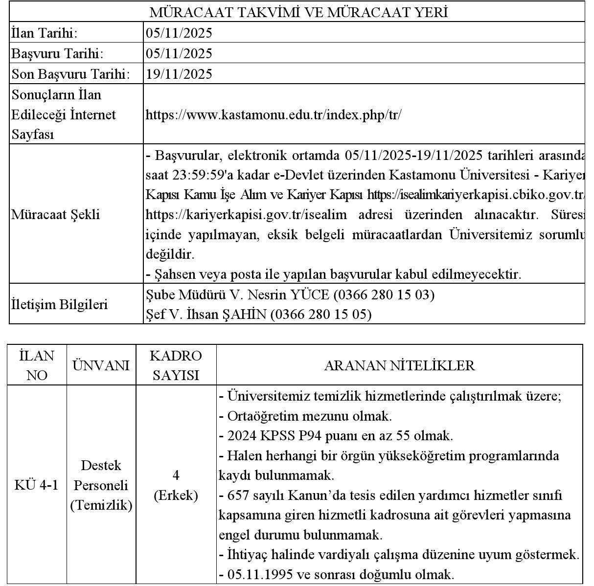 Kastamonu Üniversitesi 4 sözleşmeli personel alacak. Son başvuru tarihi 19 Kasım 2025