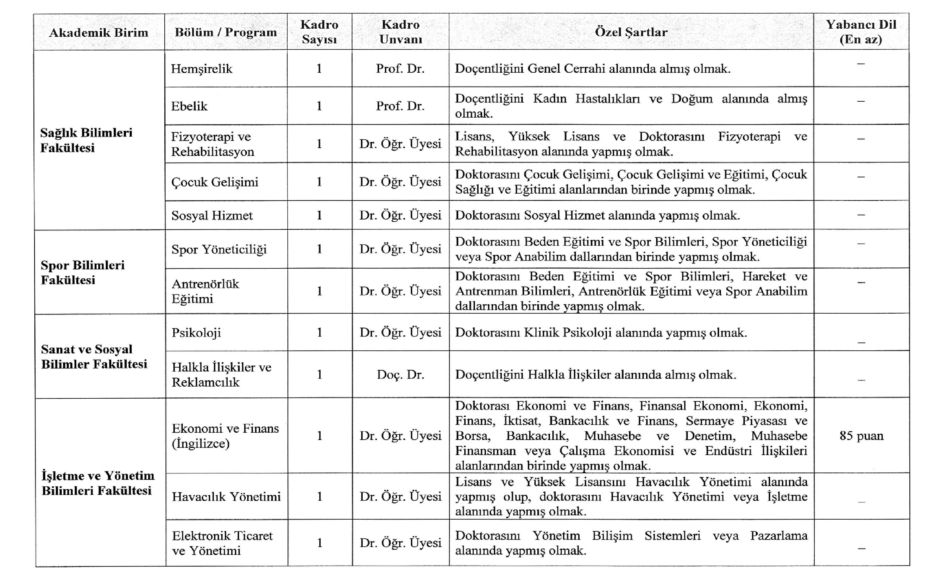 Üniversitemizin aşağıdaki tabloda belirtilen akademik birimlerine, 657 sayılı Devlet Memurları Kanıınu'nun 48'inci maddesinde belirtilen genel şartları taşıyan, 2547 sayılı Yükseköğretim Kanunu ile Öğretim Üyeliğine Yükseltilme ve Atanma Yönetmeliği'nin ilgili maddeleri uyarınca öğretim üyesi alınacaktır. Başvuracak adayların, söz konusu kanun ve yönetmelik kapsamındaki şartlan taşıması ve istenen belgeleri tamamlaması gerekmektedir.