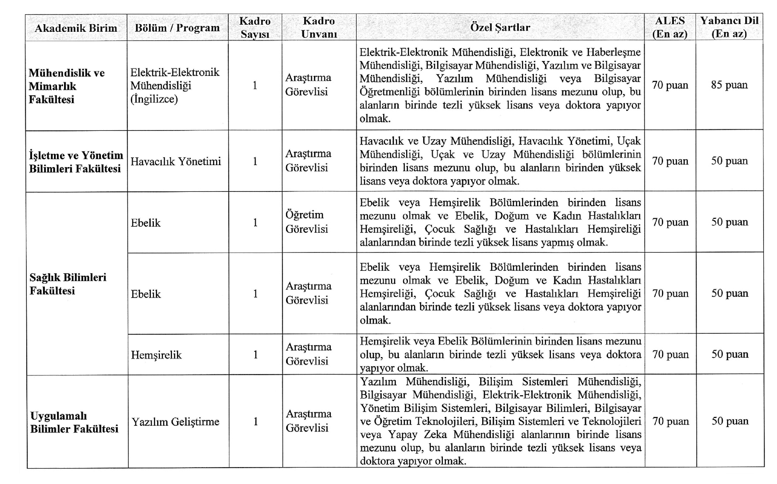 Üniversitemizin aşağıdaki tabloda belirtilen akademik birimlerine, 657 sayılı Devlet Memurları Kanunu'nun 48'inci maddesinde belirtilen genel şartları taşıyan, 2547 sayılı Yükseköğretim Kanunu ile Öğretim Üyesi Dışındaki Öğretim Elemanı Kadrolarına Yapılacak Atamalarda Uygulanacak Merkezi Sınav ile Giriş Sınavlarına İlişkin Usul ve Esaslar Hakkında Yönetmelik'in ilgili maddeleri uyarınca araştırma görevlisi alınacaktır. Başvuracak adayların, söz konusu kanun ve yönetmelik kapsamındaki şartları taşıması ve istenen belgeleri tamamlaması gerekmektedir.