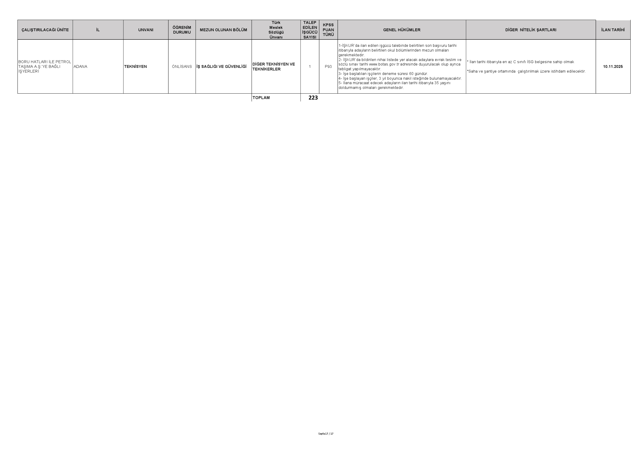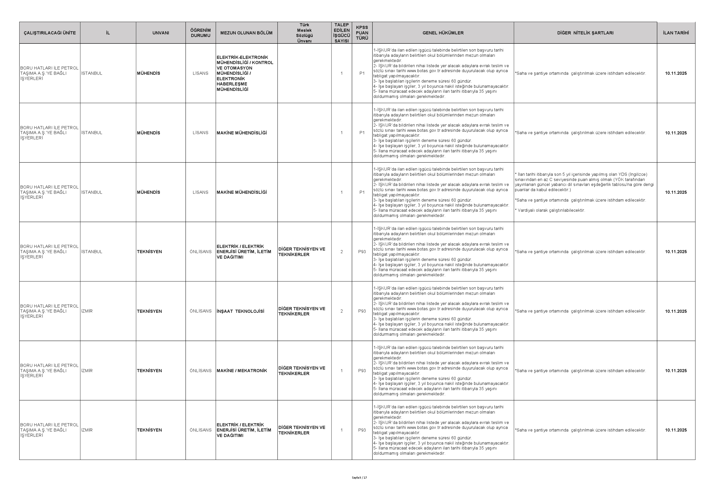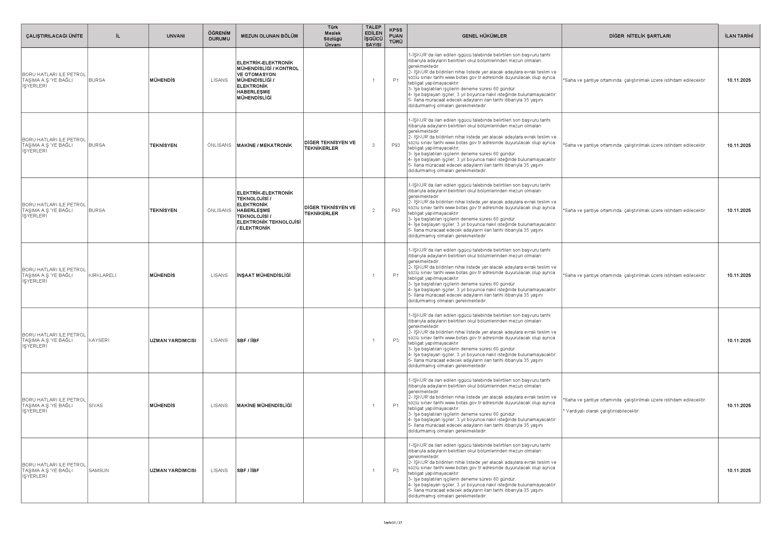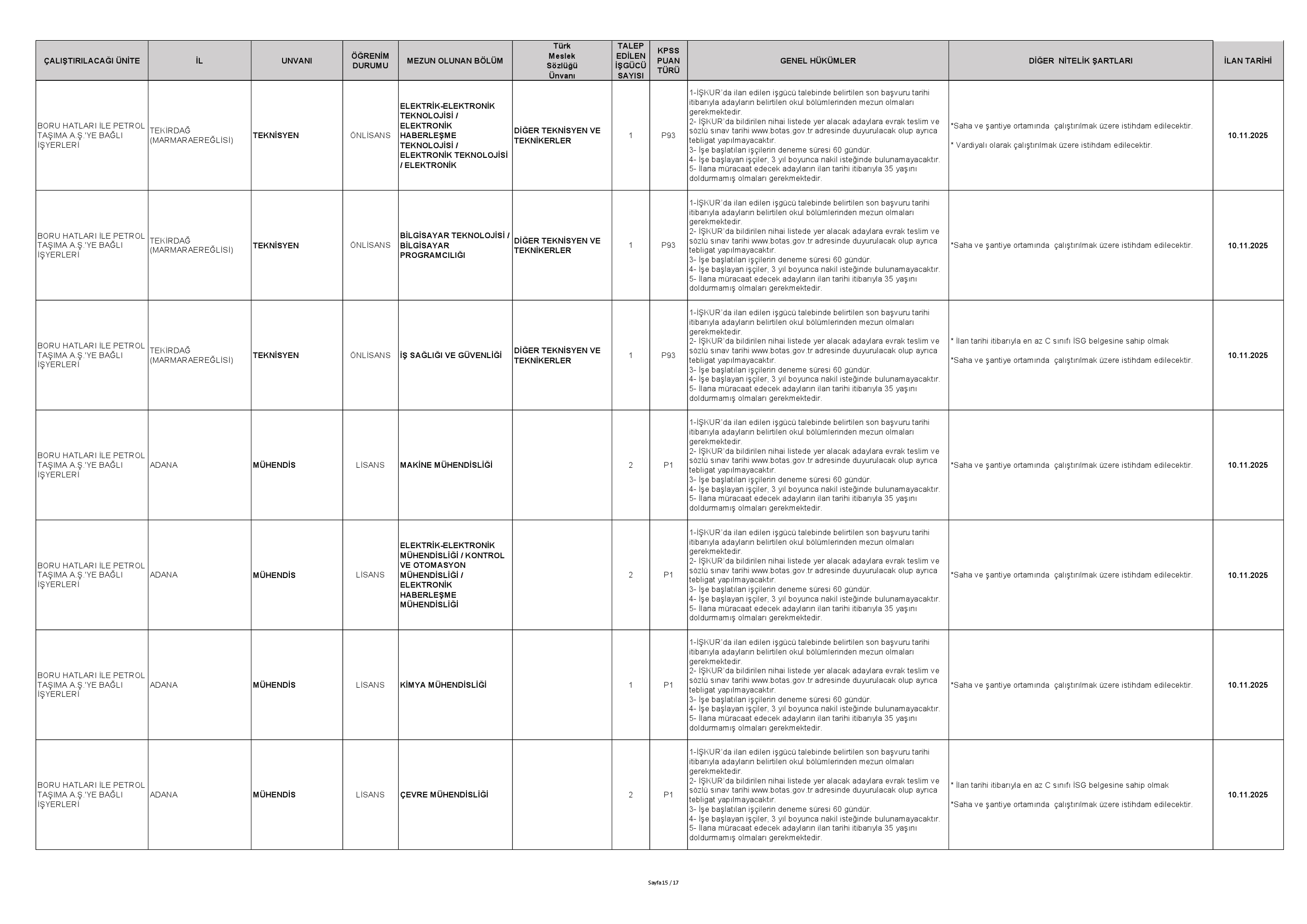 BOTAŞ 223 İşçi Alacak. Son başvuru tarihi 14 Kasım 2025