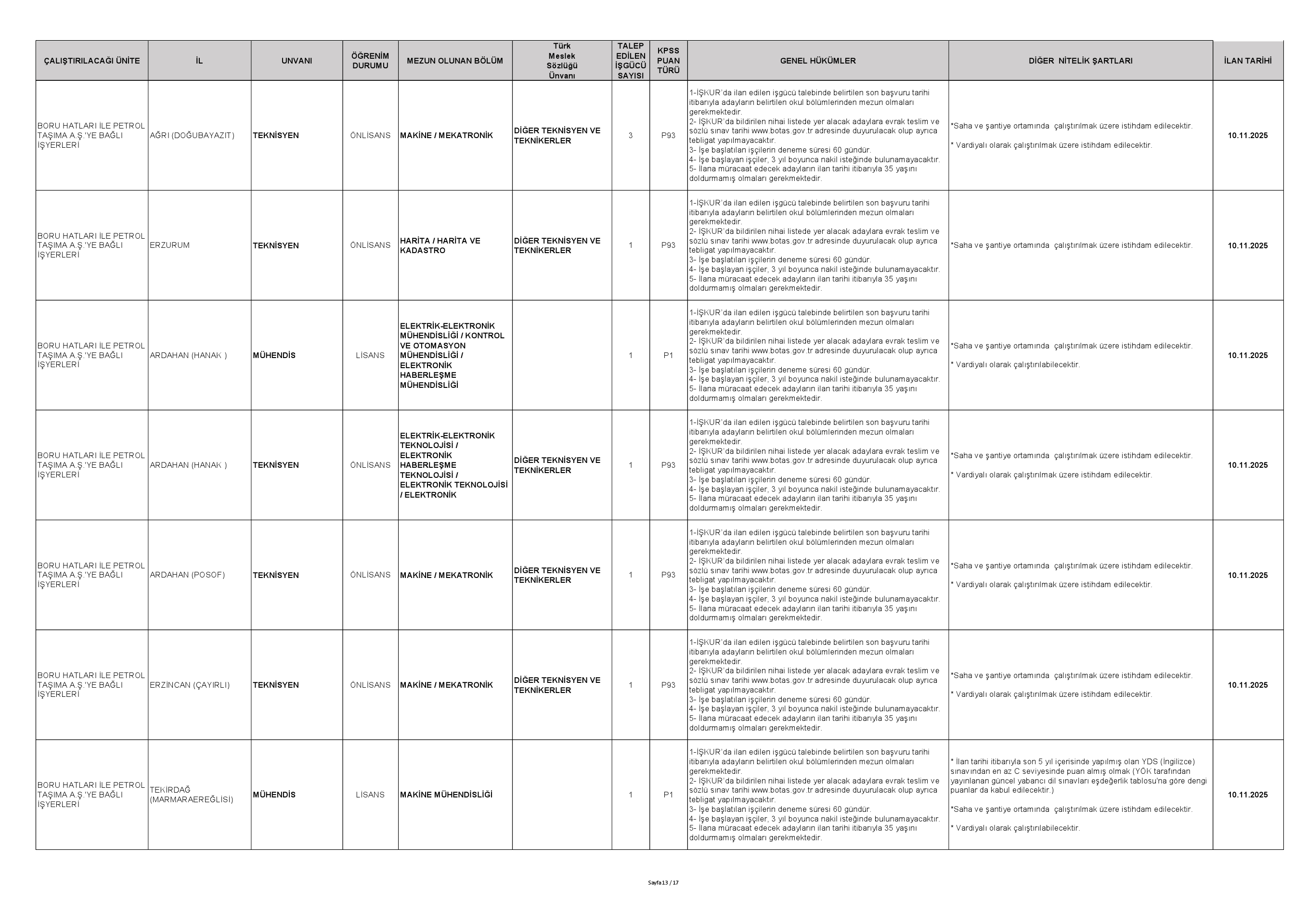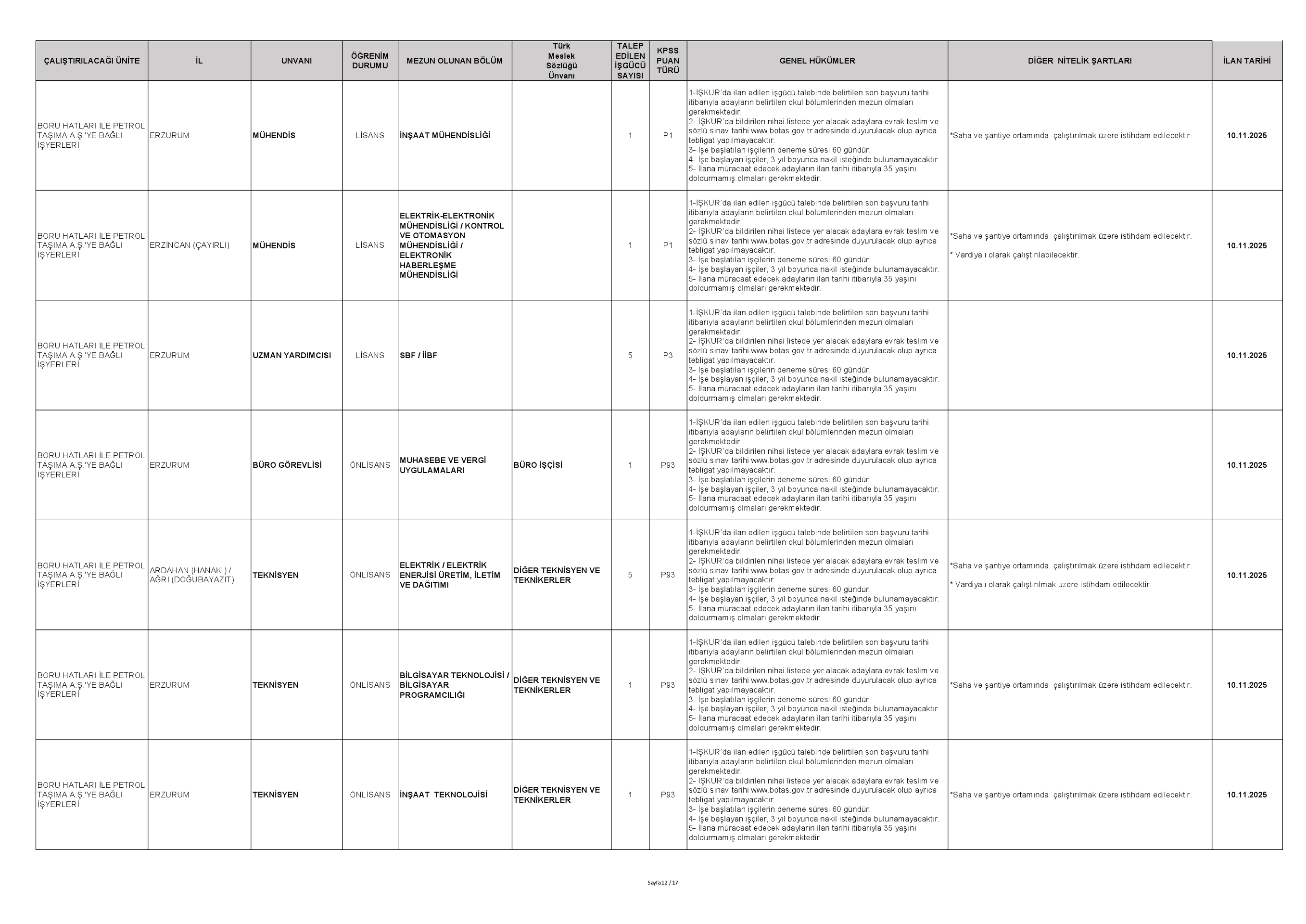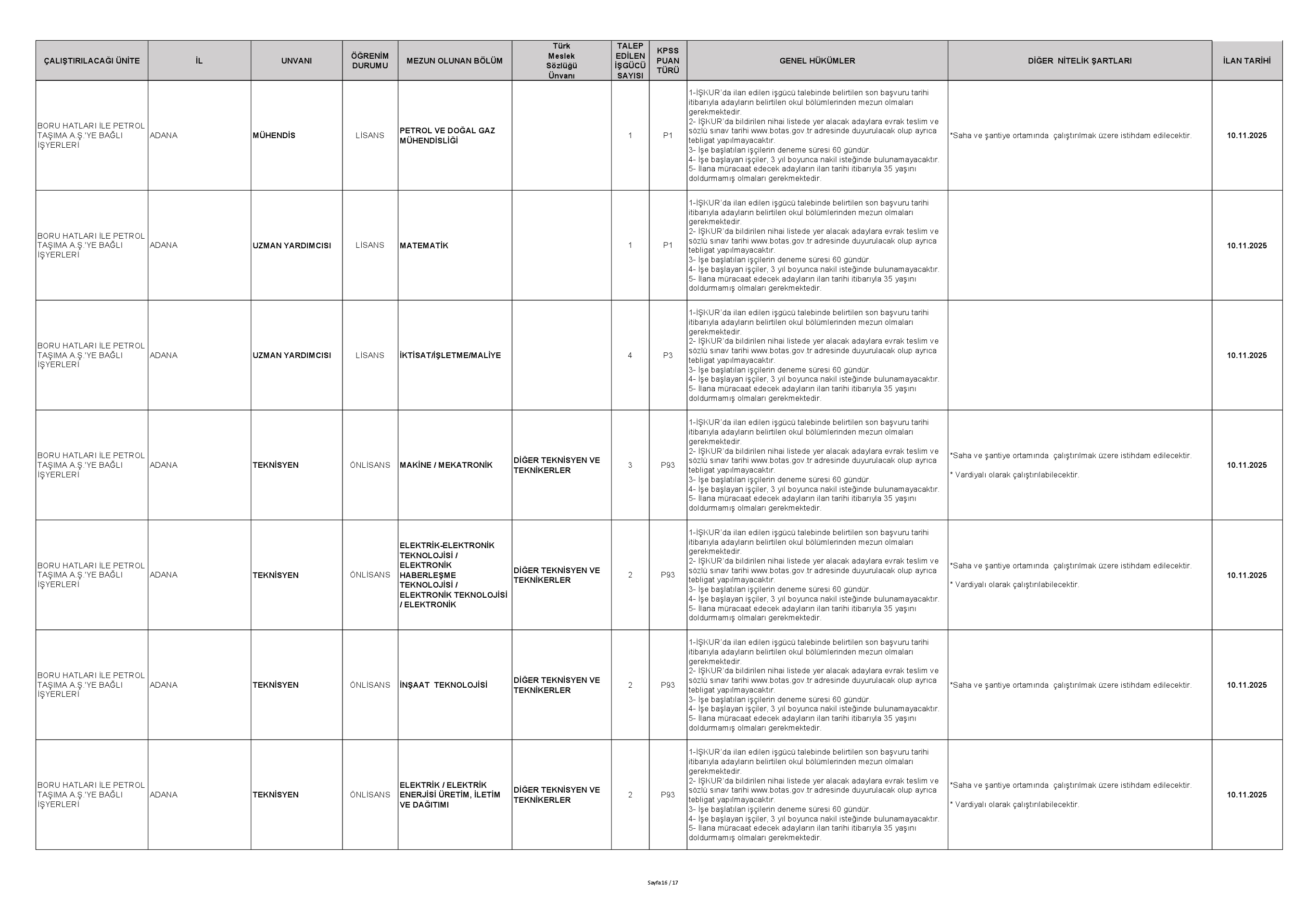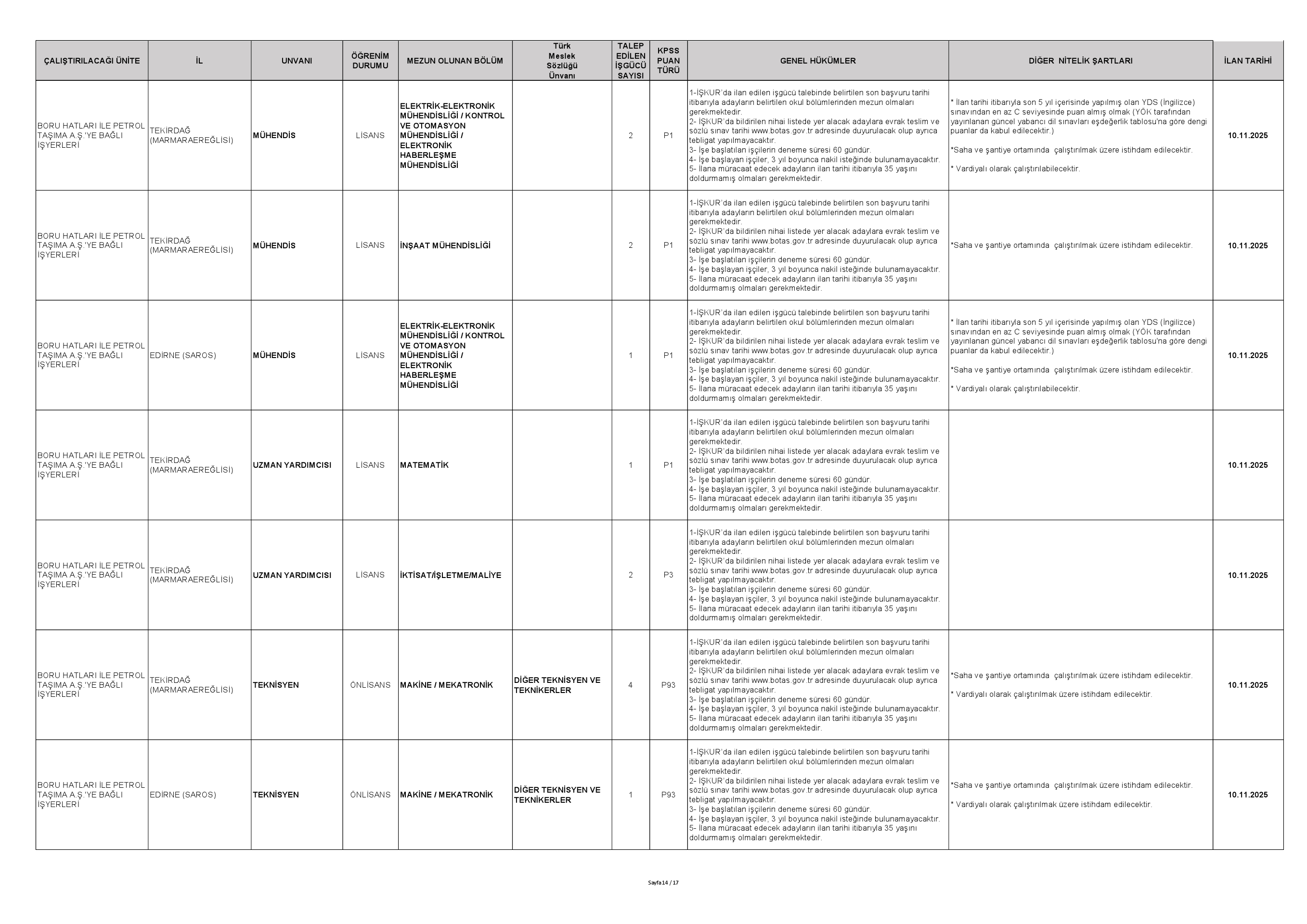 BORU HATLARI İLE PETROL TAŞIMA A.Ş. GENEL MÜDÜRLÜĞÜ 223 Kişilik Personel Alım Duyurusu