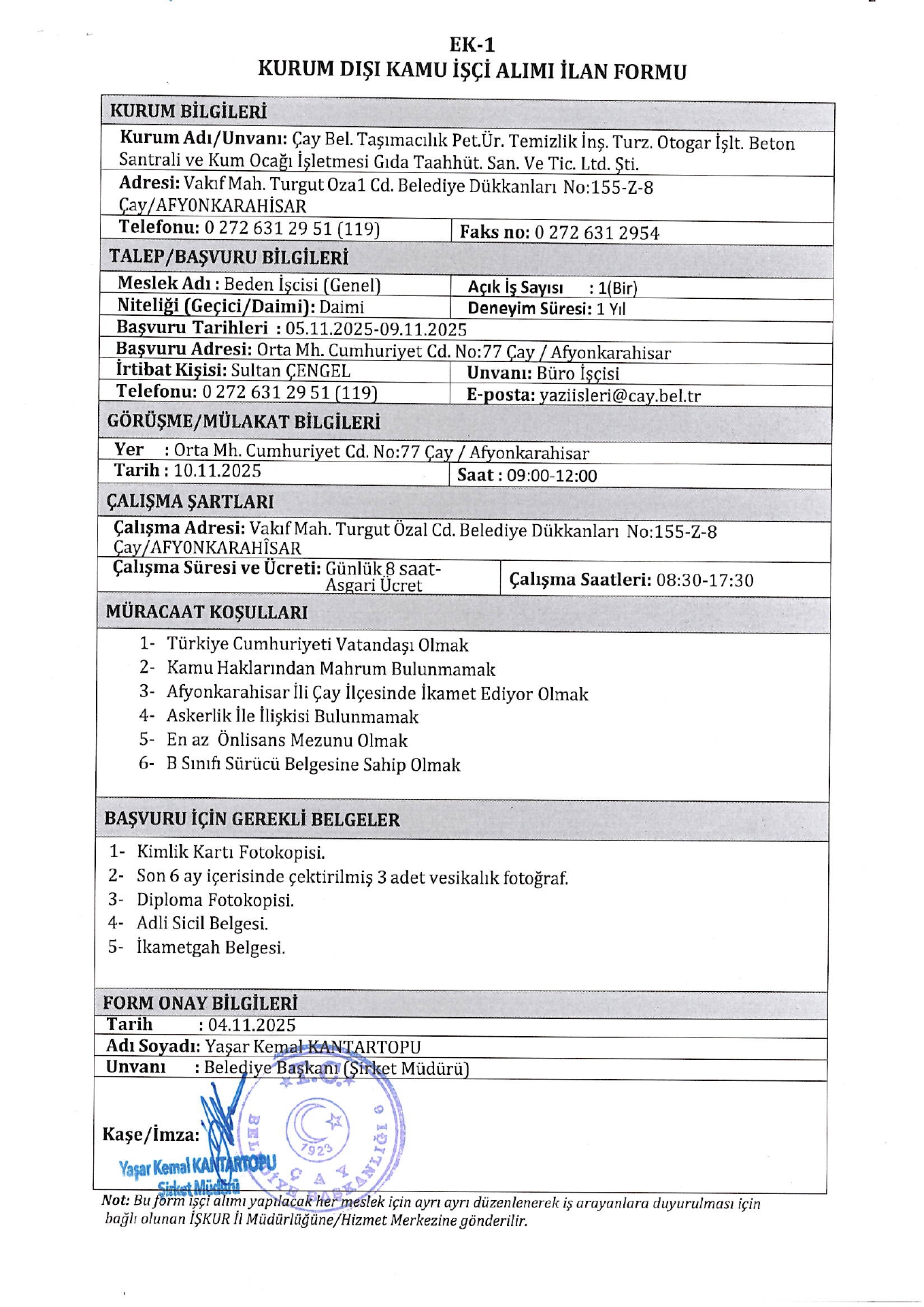Ana sayfaDaimi İşçi İlanları Afyonkarahisar Çaybel 1 İşçi Alacak Afyonkarahisar Çaybel 1 İşçi Alacak. Son başvuru tarihi 9 Kasım 2025 Kaynak : İşkur İlan Giriş : 05 Kasım 2025 23:13, Son Güncelleme : 05 Kasım 2025 23:37 Yazdır Yorumlar (0) Abone Ol