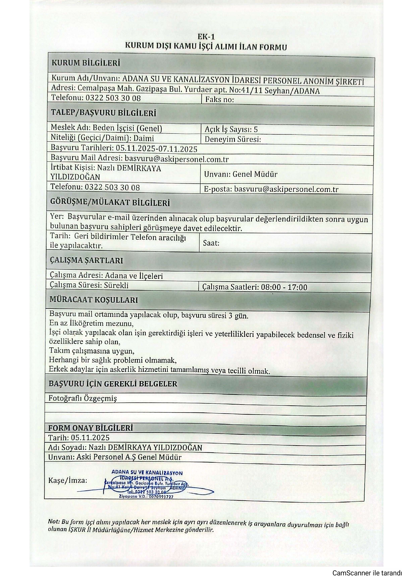 Ana sayfaDaimi İşçi İlanlarıAna sayfaEngelli İlanları Adana Su ve Kanalizasyon İdaresi 5 İşçi Alacak Adana Su ve Kanalizasyon İdaresi 5 İşçi Alacak. Son başvuru tarihi 7 Kasım 2025 Kaynak : İşkur İlan Giriş : 05 Kasım 2025 23:17, Son Güncelleme : 05 Kasım 2025 23:36 Yazdır Yorumlar (0) Abone Ol