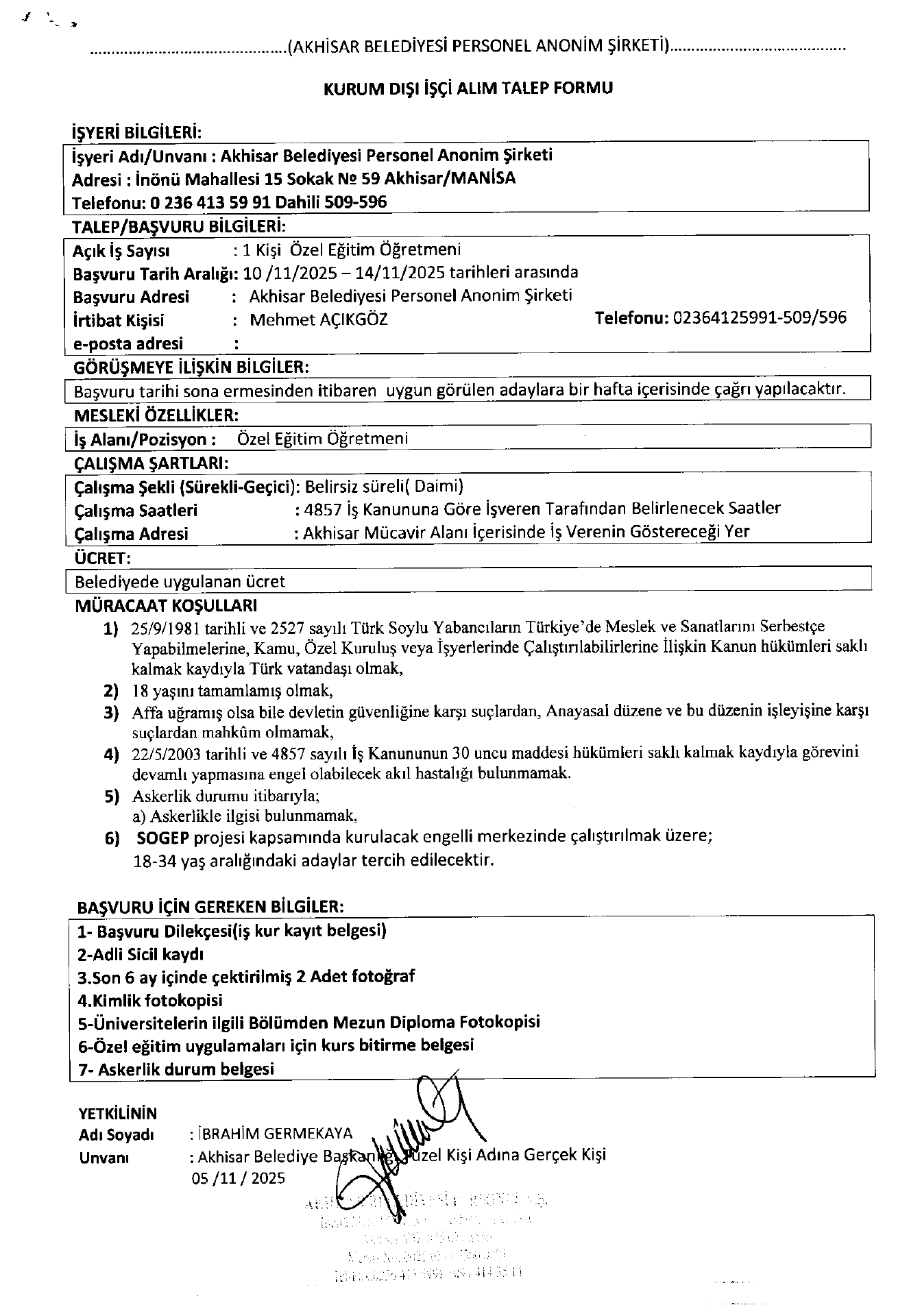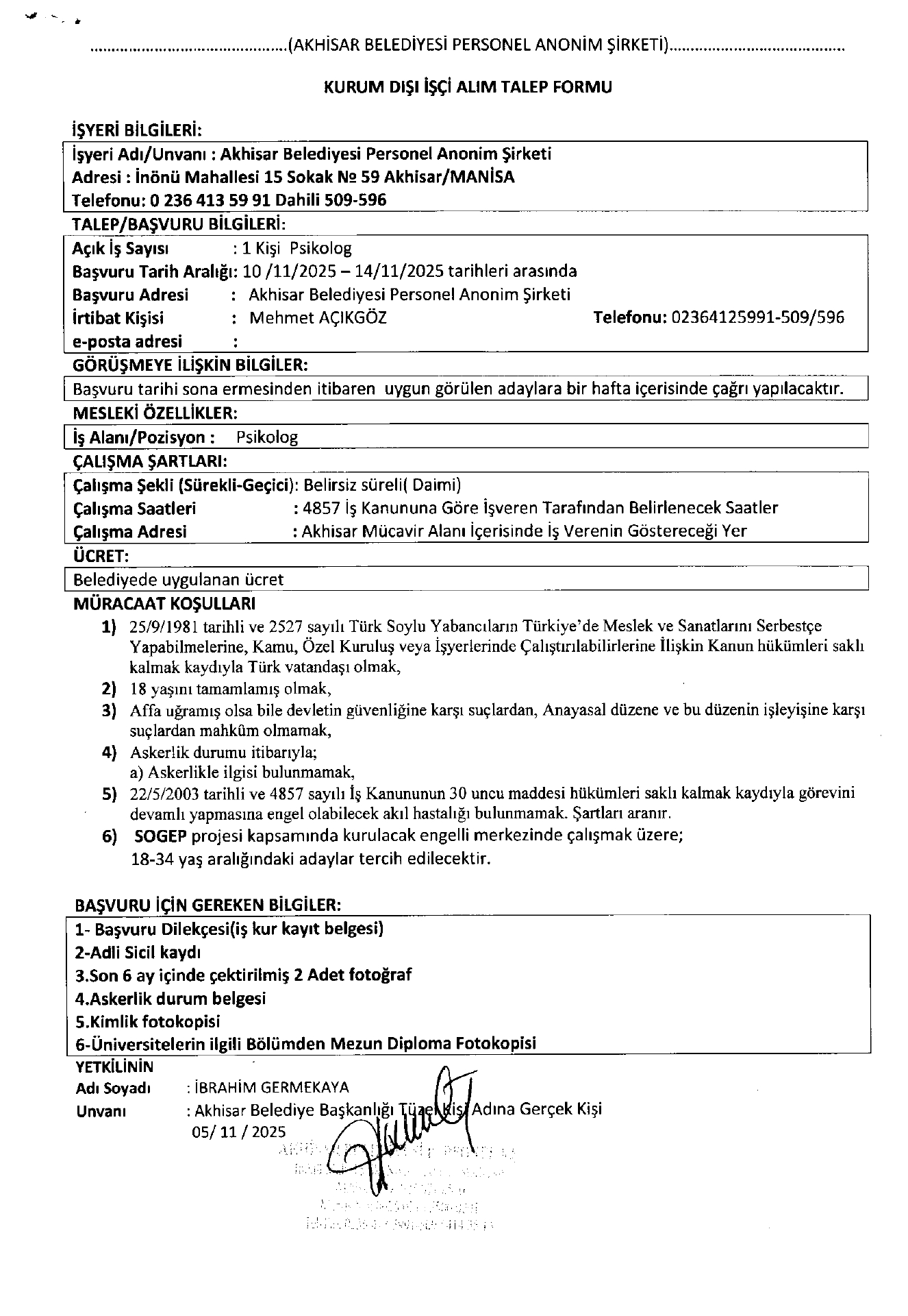 Ana sayfaDaimi İşçi İlanları Manisa Akhisar Belediyesi 2 İşçi Alacak Manisa Akhisar Belediyesi 2 İşçi Alacak. Son başvuru tarihi 14 Kasım 2025 Kaynak : İşkur İlan Giriş : 05 Kasım 2025 23:20, Son Güncelleme : 05 Kasım 2025 23:35 Yazdır Yorumlar (0) Abone Ol