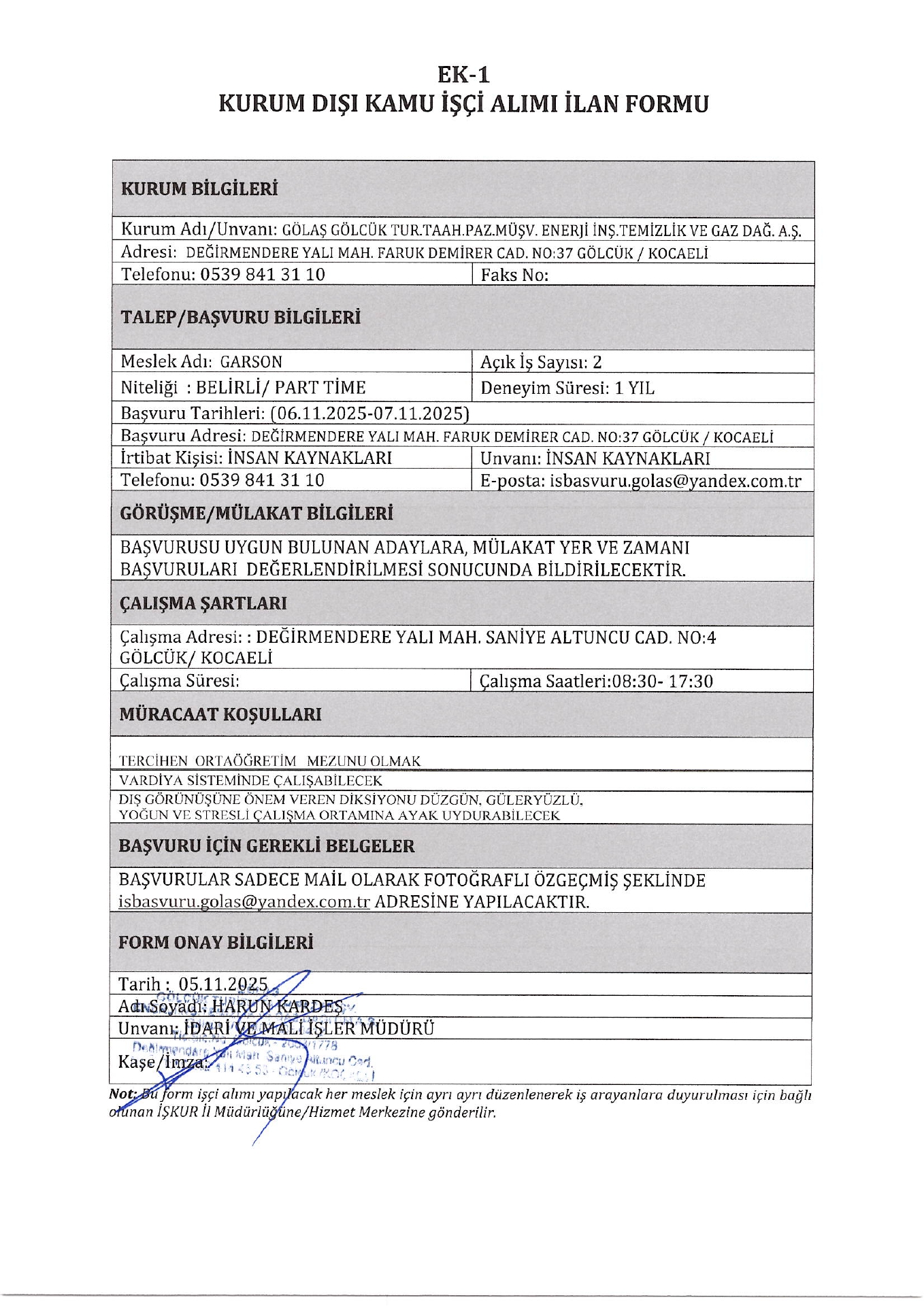 Kocaeli Gölaş Geçici 5 İşçi Alacak. Son başvuru tarihi 7 Kasım 2025