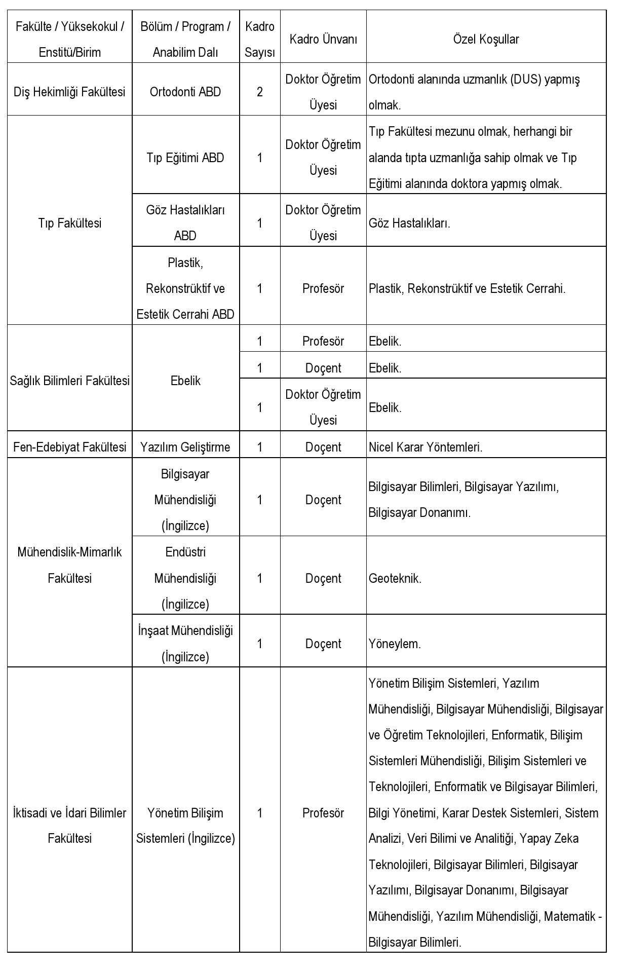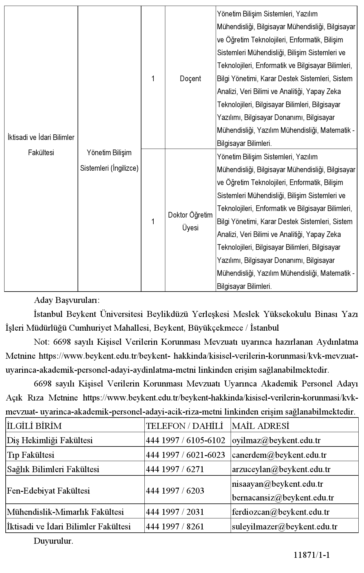 Üniversitemize 2547 sayılı Yükseköğretim Kanunu ve "Öğretim Üyeliğine Yükseltilme ve Atanma Yönetmeliği" ile "İstanbul Beykent Üniversitesi Öğretim Üyeliğine Yükseltme ve Atama Yönergesi" (https://www.beykent.edu.tr/yonetmelikler-yonergeler/yonergeler) hükümlerinde aranan koşulları yerine getirmiş olmak kaydı ile aylık ve özlük hakları yönünden 4857 sayılı İş Kanunu hükümlerine tabi Diş Hekimliği Fakültesi, Tıp Fakültesi, Sağlık Bilimleri Fakültesi, Fen-Edebiyat Fakültesi, Mühendislik-Mimarlık Fakültesi ve İktisadi ve İdari Bilimler Fakültesi bünyesinde çeşitli alanlarda; 15 Öğretim Üyesi alınacaktır. İlana konu olan kadrolar tam zamanlıdır.