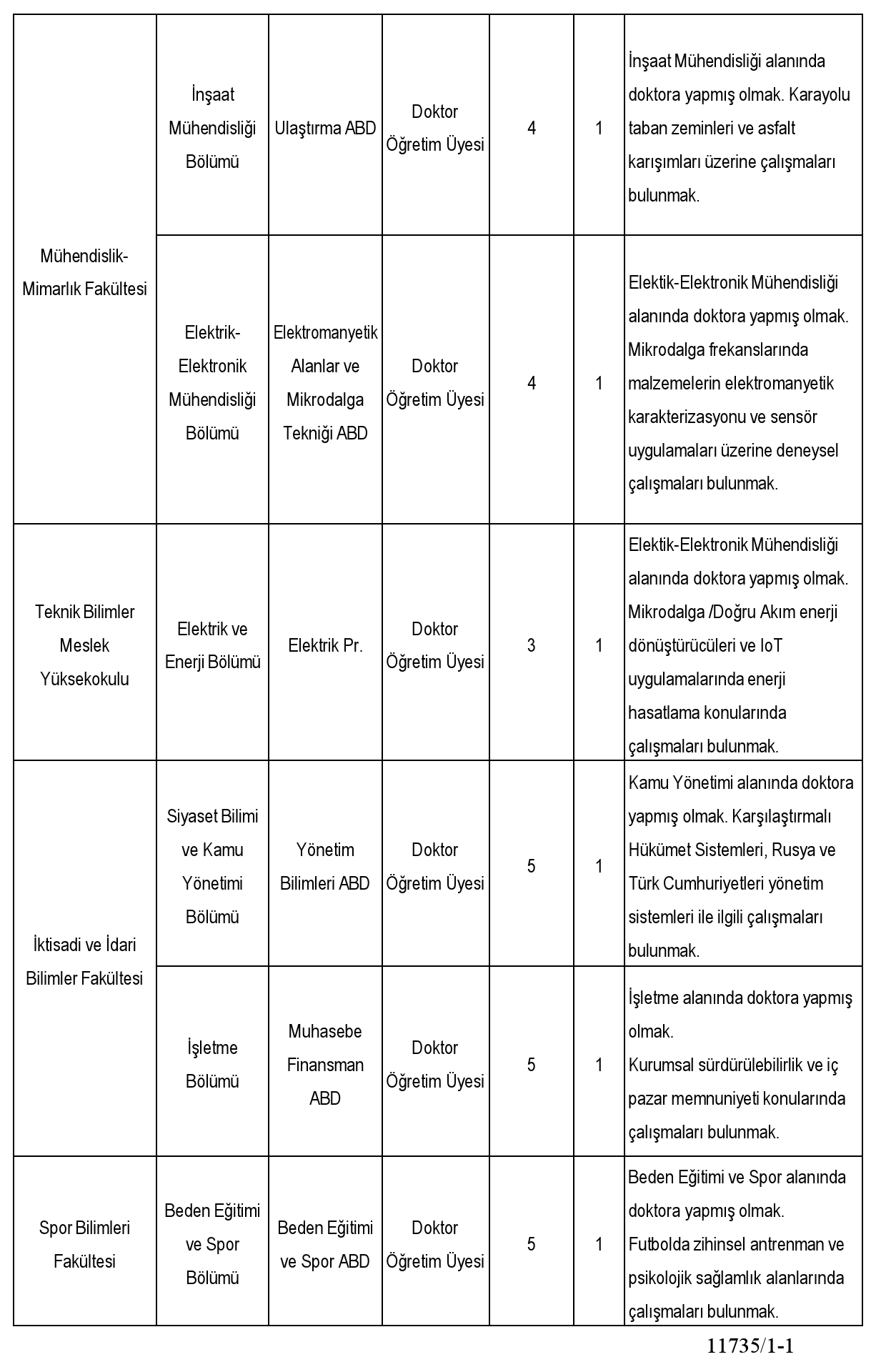 Üniversitemizin aşağıda belirtilen birimlerine 2547 sayılı Kanun, 657 sayılı Devlet Memurları Kanunu'nun 48. maddesi ile Öğretim Üyeliğine Yükseltilme ve Atanma Yönetmeliği'nin ilgili maddeleri ve Kilis 7 Aralık Üniversitesi Öğretim Üyeliğine Yükseltilme ve Atanma Yönergesi hükümlerine göre öğretim üyesi alınacaktır. Başvurular 06.11.2025 tarihinde başlayacak ve 20.11.2025 tarihi mesai bitiminde sona erecektir. Başvurular şahsen veya posta ile yapılacak olup, süresi içinde yapılmayan başvurular, eksik belgeli dosyalar veya postadaki gecikmeler dikkate alınmayacaktır.