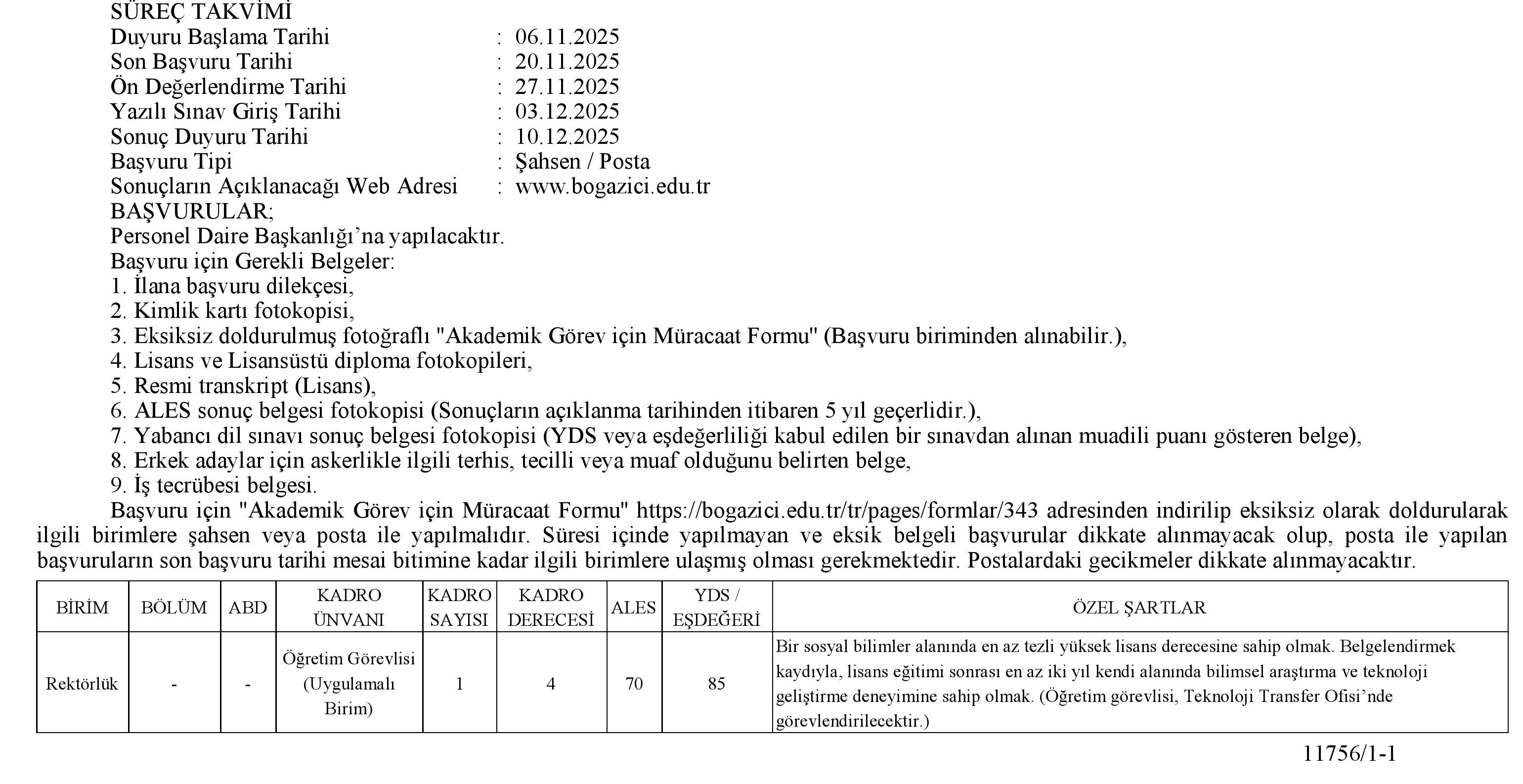 Boğaziçi Üniversitesi öğretim elemanı alacak. Son başvuru tarihi 20 Kasım 2025