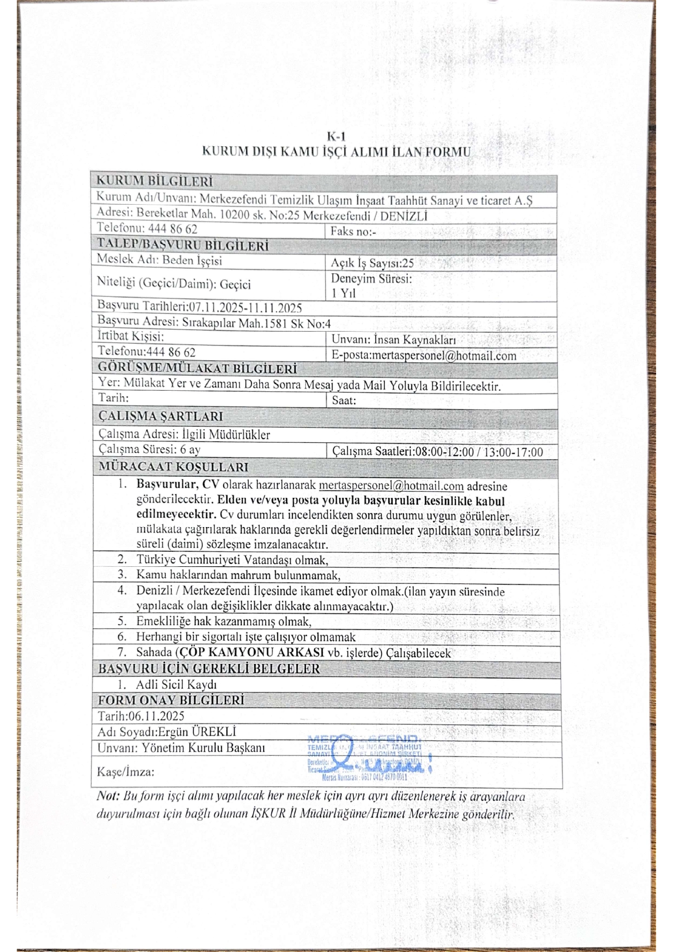 Ana sayfaGeçici İşçi İlanları Denizli Merkezefendi Temizlik Geçici 25 İşçi Alacak Denizli Merkezefendi Temizlik Geçici 25 İşçi Alacak. Son başvuru tarihi 11 Kasım 2025 Kaynak : İşkur İlan Giriş : 06 Kasım 2025 22:49, Son Güncelleme : 06 Kasım 2025 23:10 Yazdır Yorumlar (0) Abone Ol