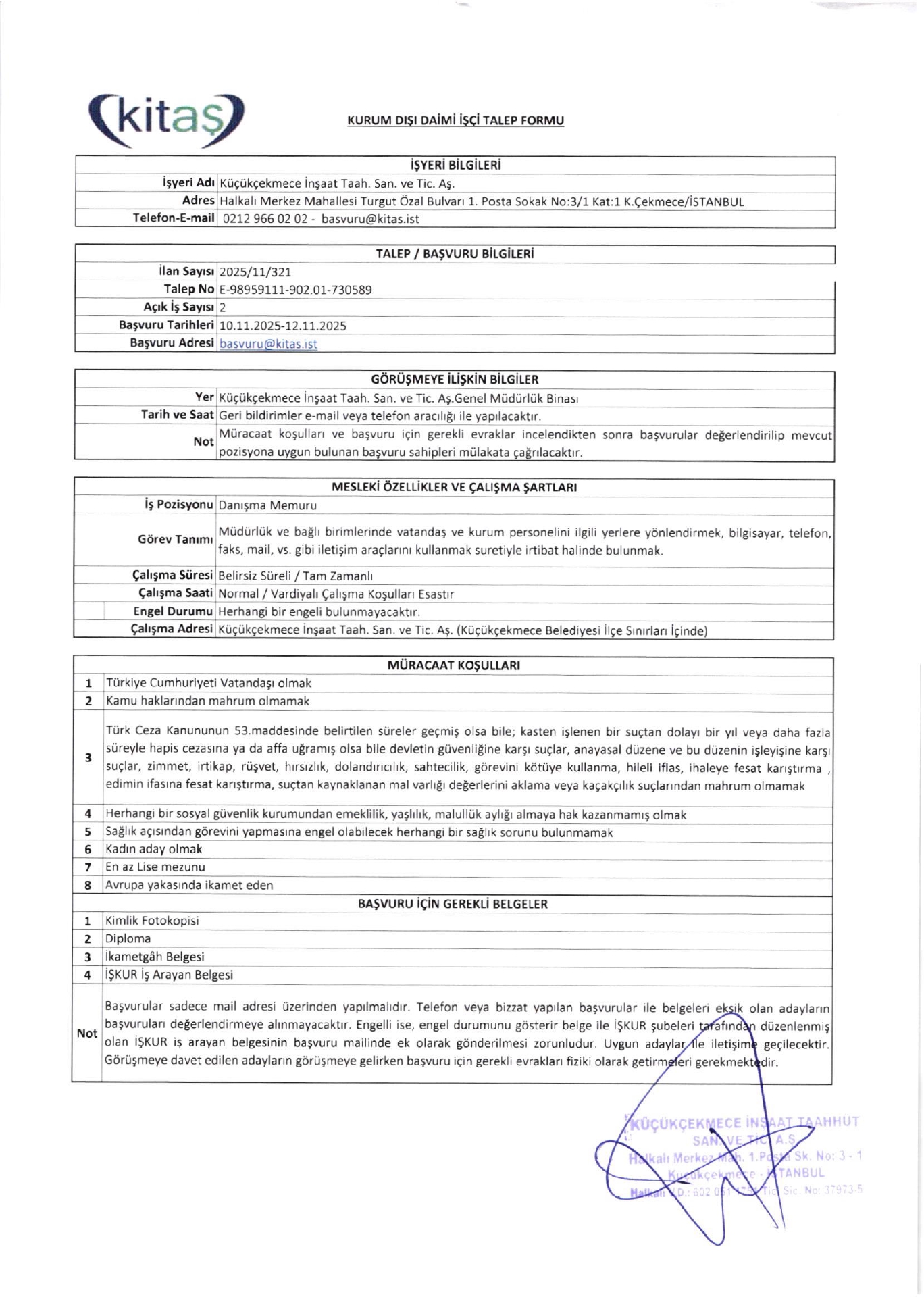 İstanbul Küçükçekmece İnşaat 2 İşçi Alacak. Son başvuru tarihi 12 Kasım 2025
