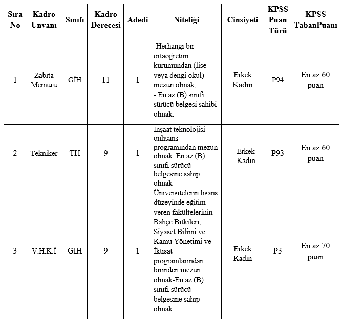 Ağrı ili Yücekapı Belediye Başkanlığı bünyesinde 657 sayılı Devlet Memurları Kanununa tabi olarak istihdam edilmek üzere; Mahalli İdarelere İlk Defa Atanacaklara Dair Sınav ve Atama Yönetmeliği ile Belediye Zabıta Yönetmeliği hükümlerine göre aşağıda unvanı, sınıfı, derecesi, adedi, nitelikleri, KPSS puan türü, KPSS taban puanı ve diğer şartları taşımak kaydıyla, belirtilen boş kadrolara açıktan atama yoluyla memur ve zabıta memuru alınacaktır.