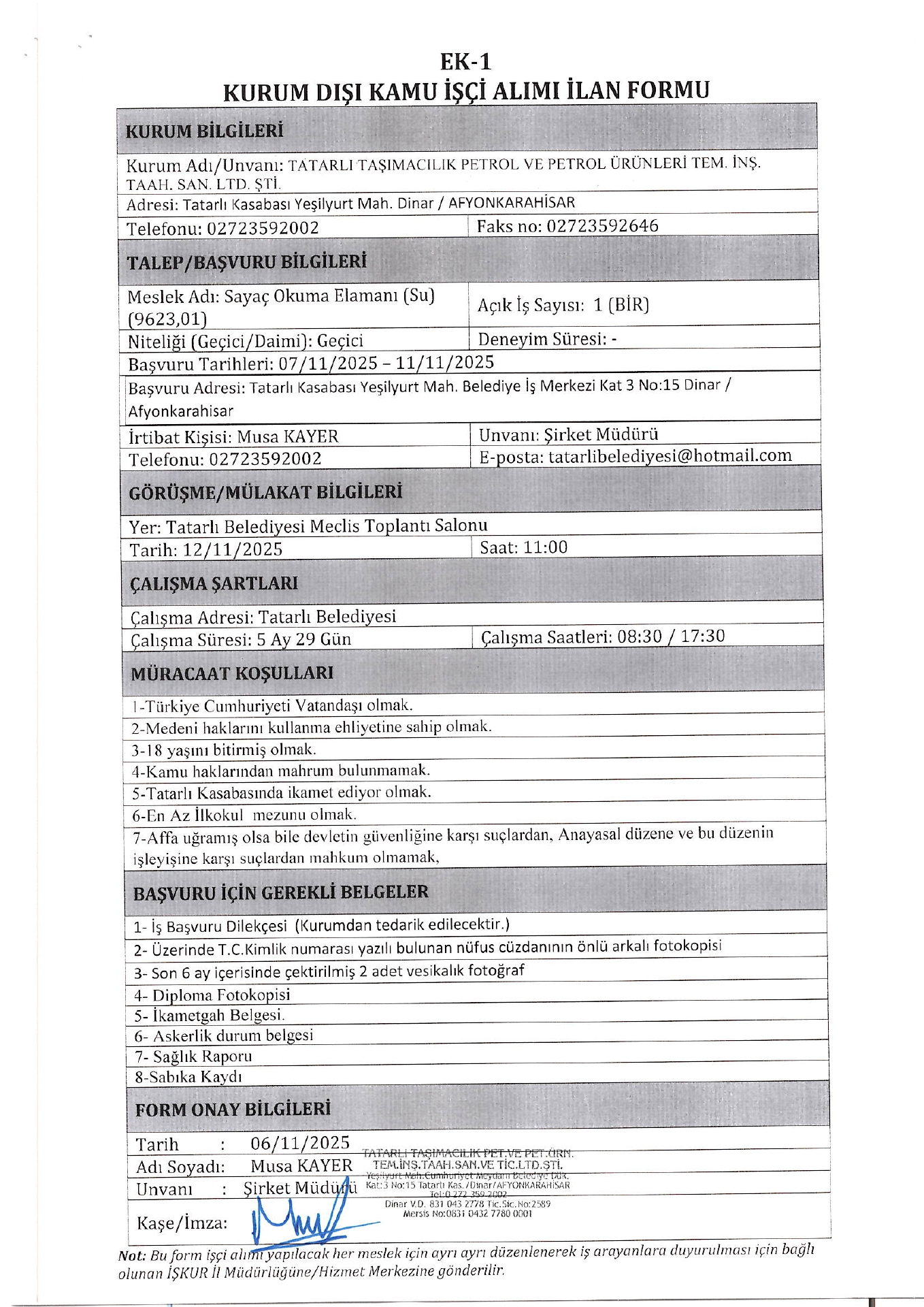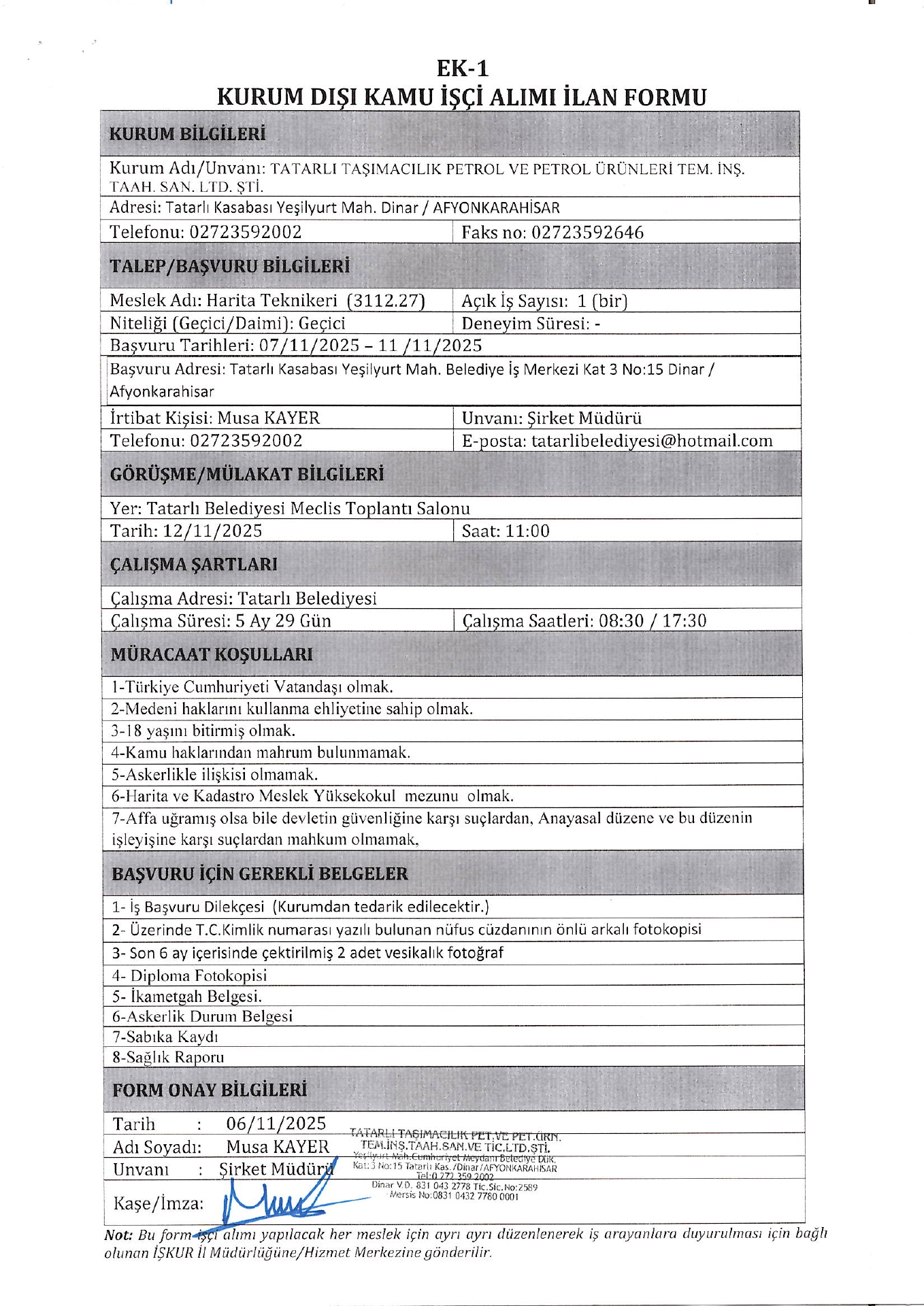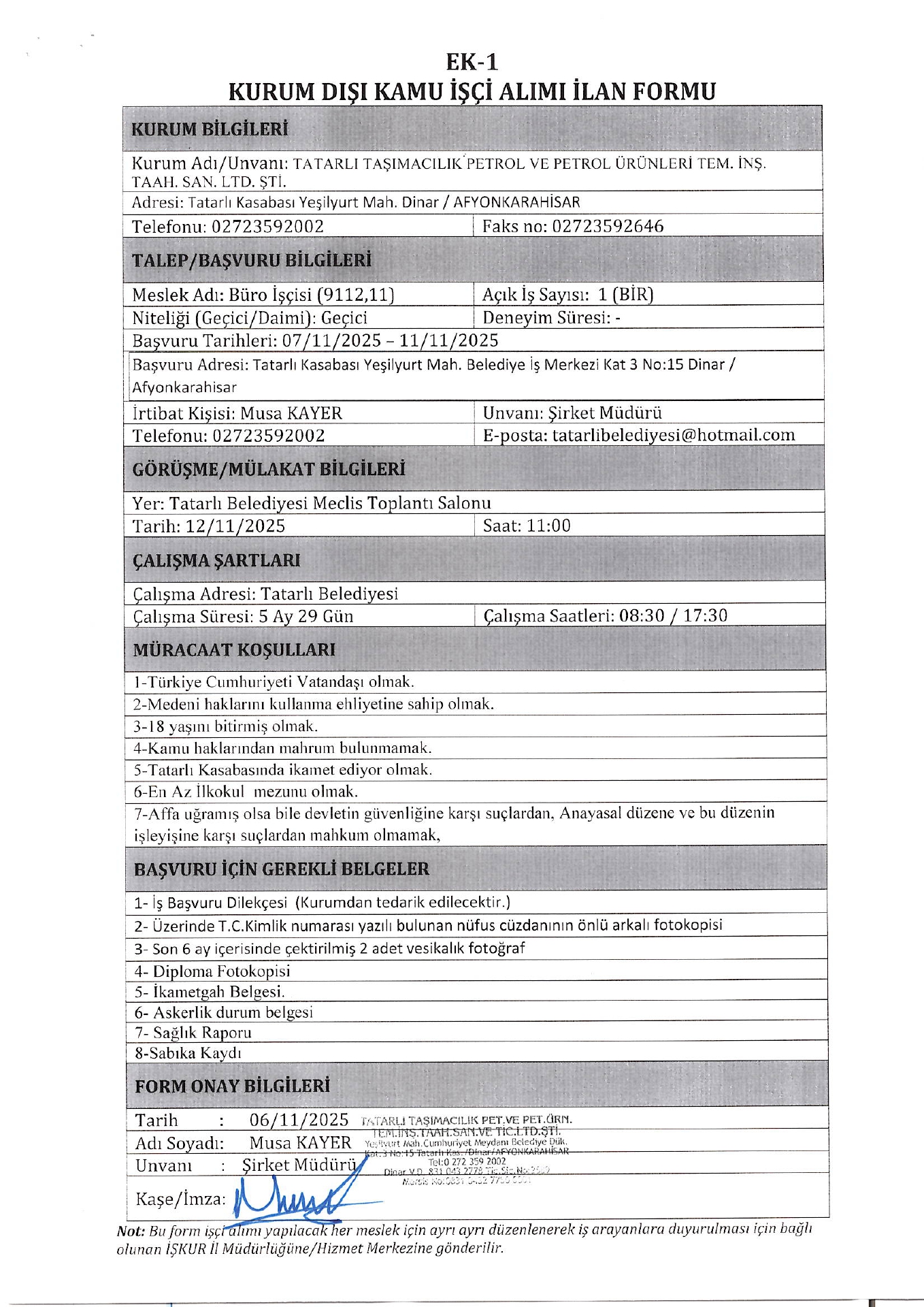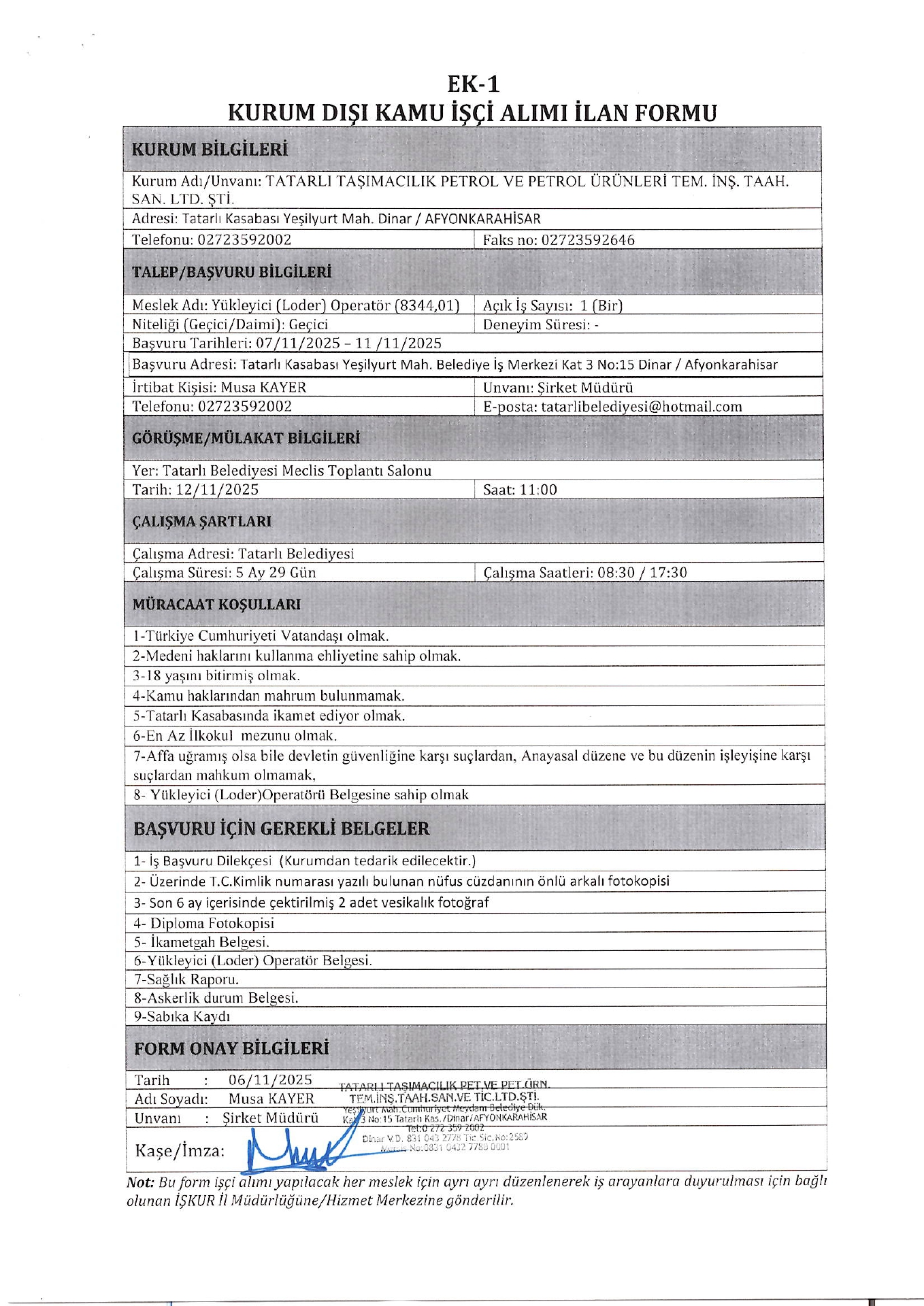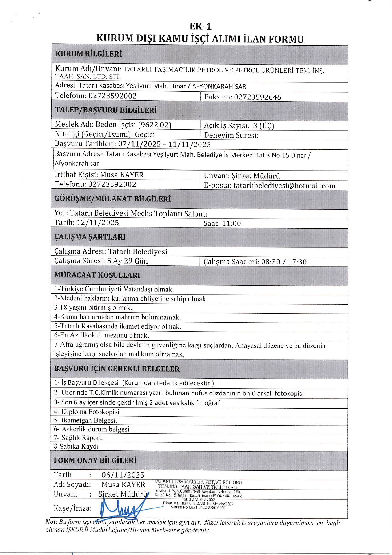 Afyonkarahisar Tatarlı Taşımacılık Geçici 7 İşçi Alacak. Son başvuru tarihi 11 Kasım 2025