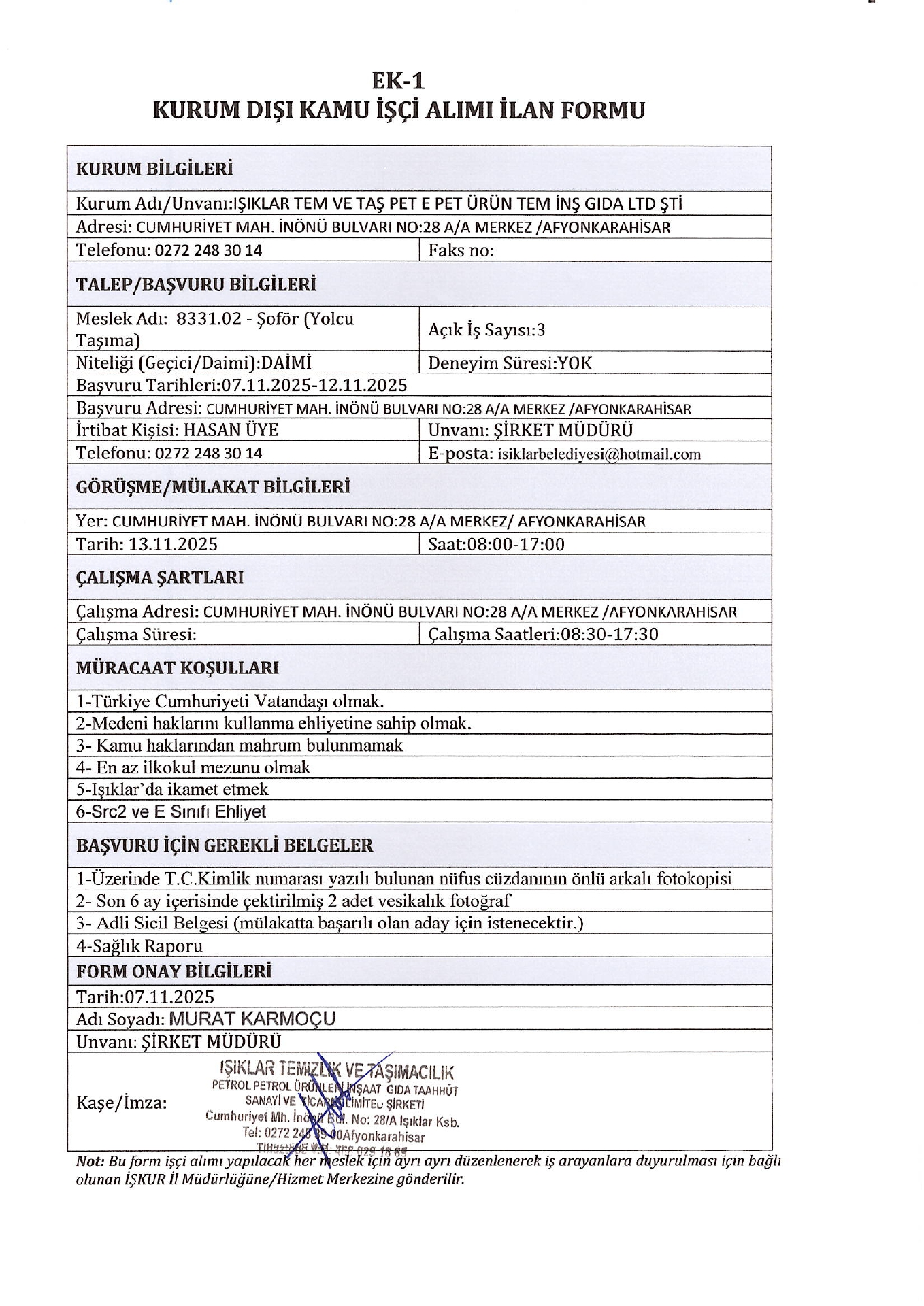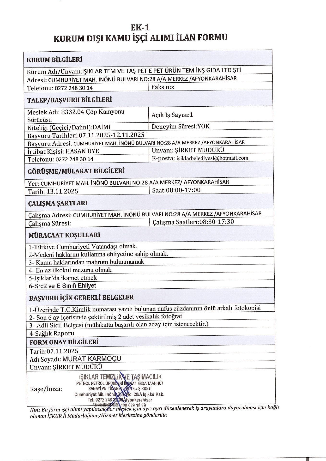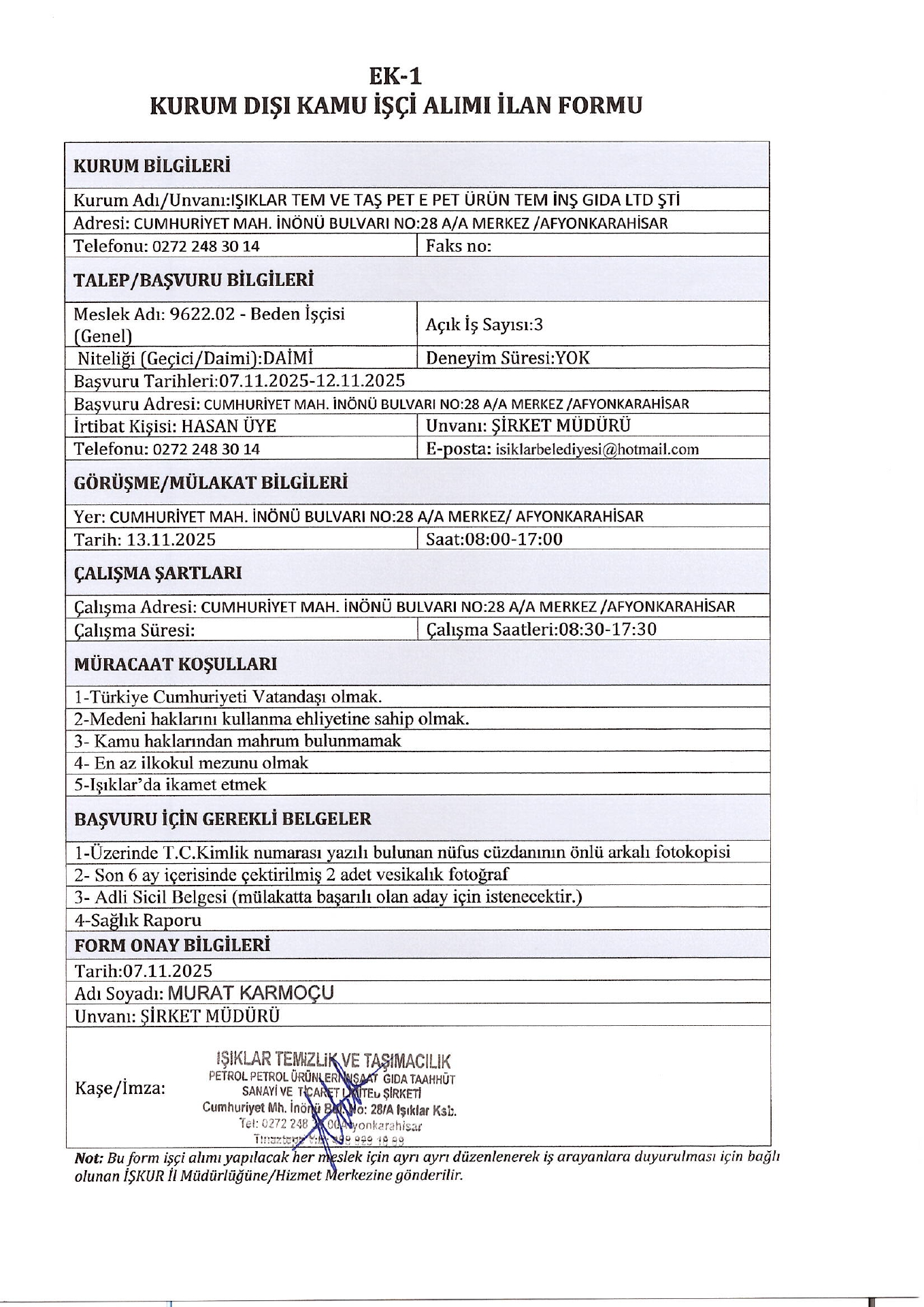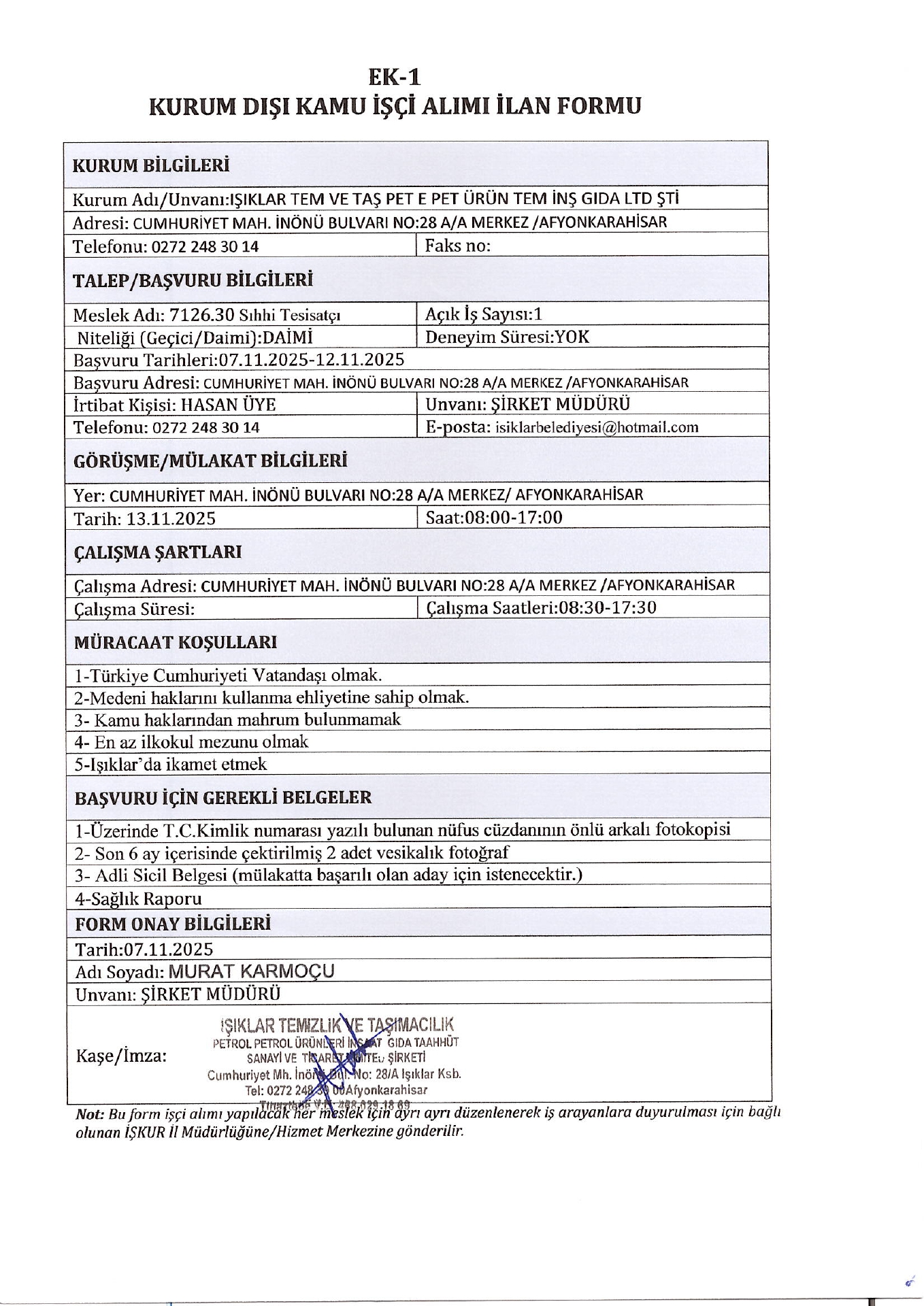 Ana sayfaDaimi İşçi İlanları Afyonkarahisar Işıklar Temizlik 7 İşçi Alacak Afyonkarahisar Işıklar Temizlik 7 İşçi Alacak. Son başvuru tarihi 12 Kasım 2025 Kaynak : İşkur İlan Giriş : 07 Kasım 2025 23:31, Son Güncelleme : 07 Kasım 2025 23:45 Yazdır Yorumlar (0) Abone Ol