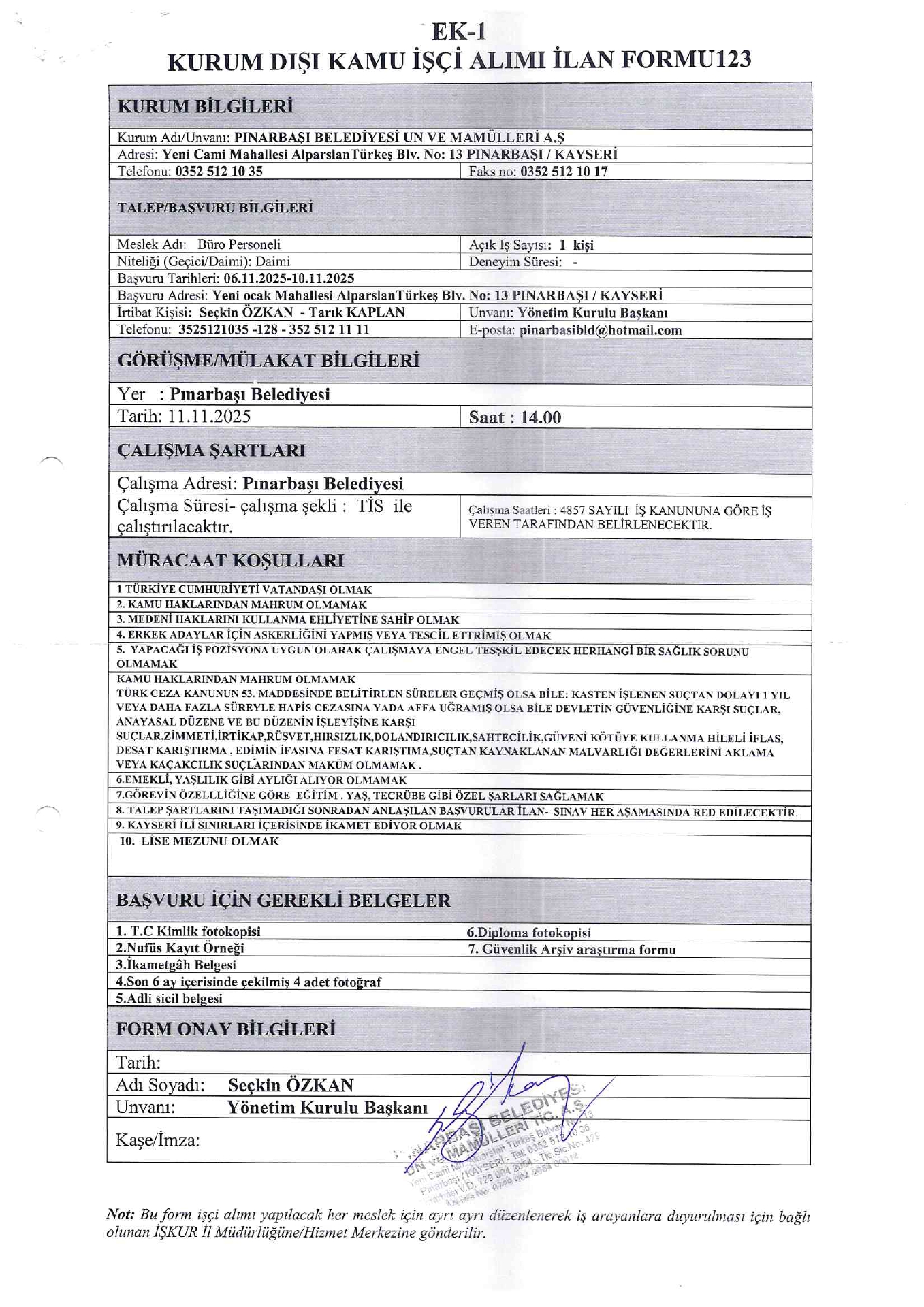 Ana sayfaDaimi İşçi İlanları Kayseri Pınarbaşı Belediyesi 1 İşçi Alacak Kayseri Pınarbaşı Belediyesi 1 İşçi Alacak. Son başvuru tarihi 11 Kasım 2025 Kaynak : İşkur İlan Giriş : 07 Kasım 2025 23:46, Son Güncelleme : 07 Kasım 2025 23:41 Yazdır Yorumlar (0) Abone Ol