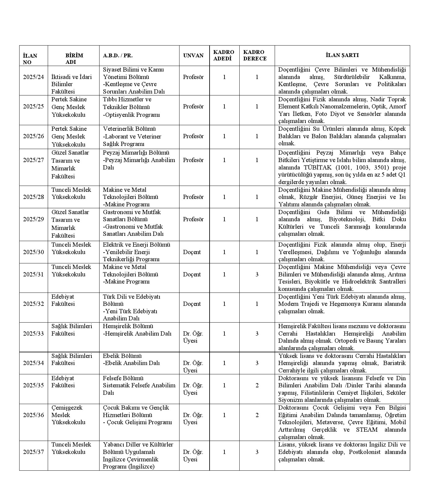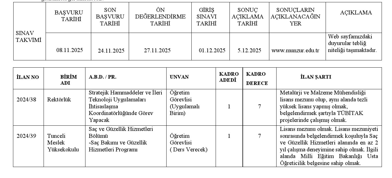 Munzur Üniversitesi Öğretim Üyesi ve Elemanı Alım İlanı. Son başvuru tarihi 22 Kasım 2025