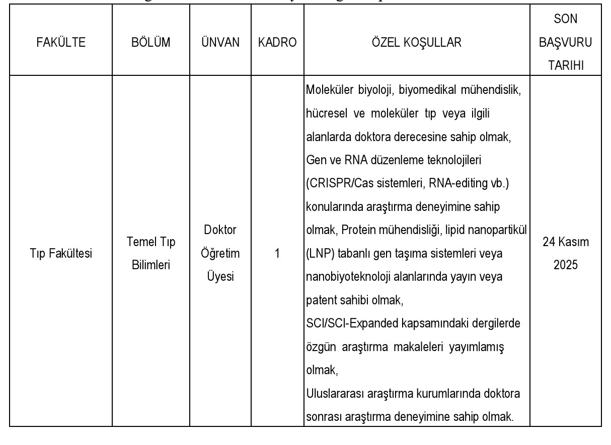 Müracaat edeceklerin bir sayfalık başvuru dilekçesini, yayın listesi ile bilimsel yayın ve akademik faaliyetlerini içeren özgeçmişini (Türkçe ve İngilizce), doçentlik belgesini (profesör ve doçent kadroları için), tıpta uzmanlık (Tıp Fakültesi için) veya doktora belgesini (doktor öğretim üyesi kadrosu için), PDF formatında ilanda belirtilen son başvuru tarihine kadar [email protected] e-posta adresine göndermeleri gerekmektedir.