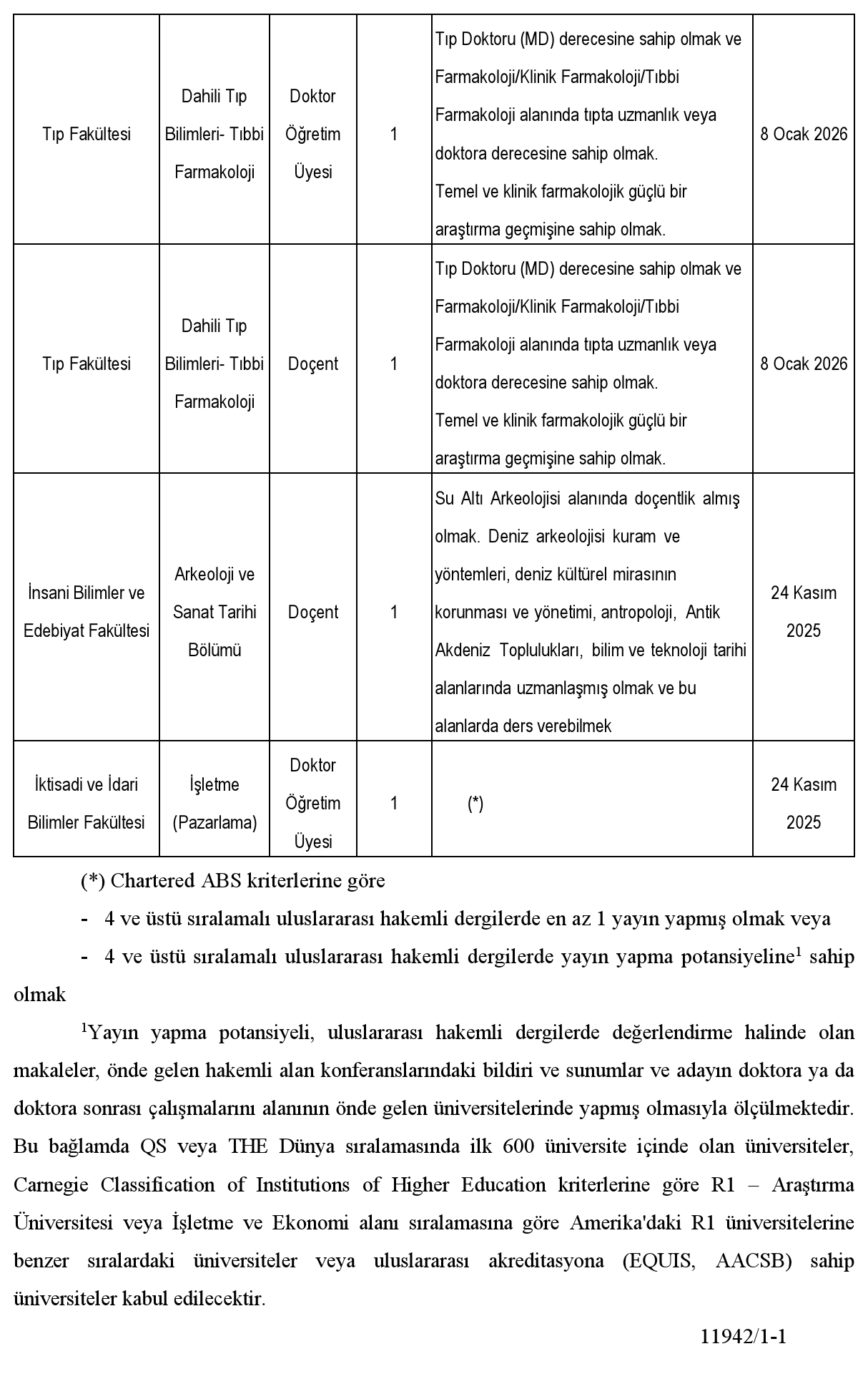 2547 sayılı Yüksek Öğretim Kanunu ve Öğretim Üyeliğine Yükseltilme ve Atanma Yönetmeliği'nin ilgili maddeleri uyarınca, Üniversitemizin aşağıdaki tabloda belirtilen fakültelerine tam zamanlı öğretim üyeleri alınacaktır.