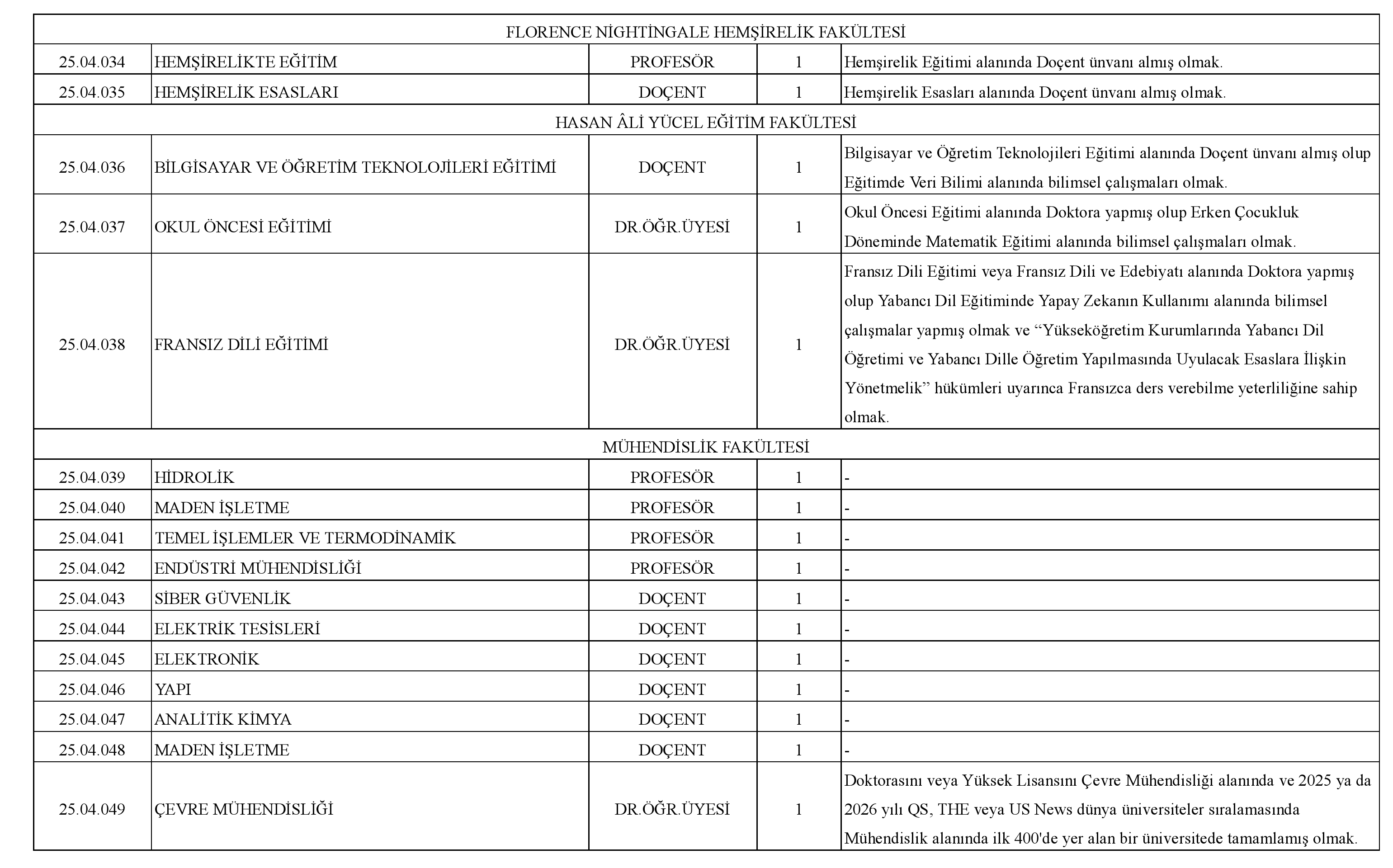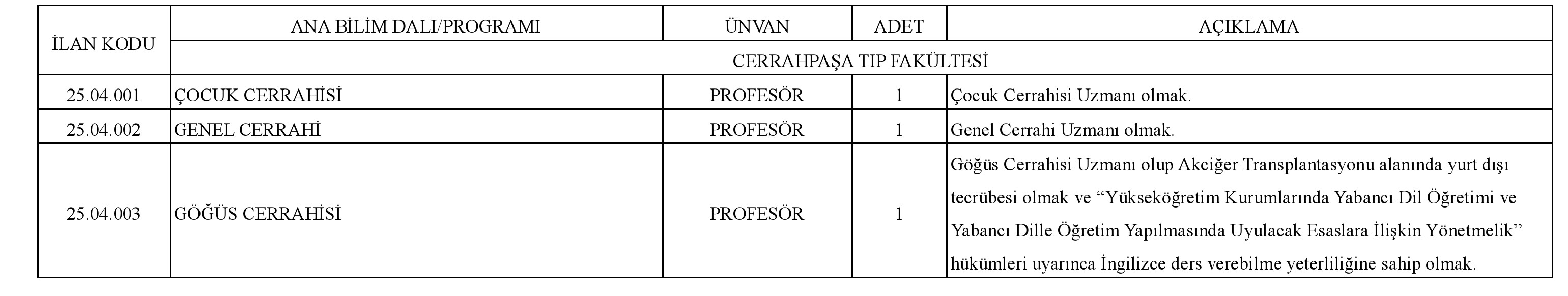 Üniversitemizin aşağıda ismi yazılı birimlerine, 2547 sayılı Yükseköğretim Kanunu'nun ilgili maddeleri 657 sayılı Devlet Memurları Kanunu'nun 48. maddesi, "Öğretim Üyeliğine Yükseltilme ve Atanma Yönetmeliği" nin ilgili maddeleri ve "İstanbul Üniversitesi-Cerrahpaşa Akademik Atanma Kriterlerine Dair Yönerge" uyarınca; Profesör, Doçent ve Doktor Öğretim Üyesi alınacaktır.