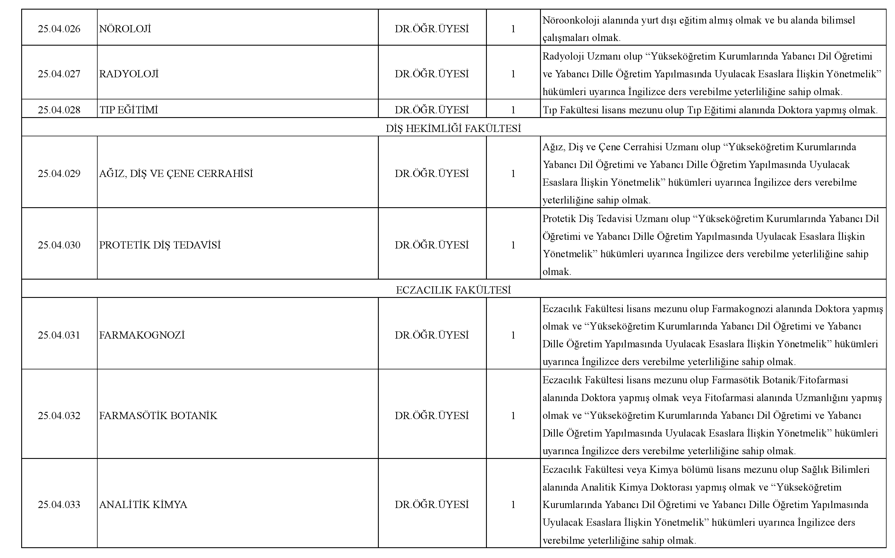9) İlan edilen bütün ünvanlar için Yabancı Ülkelerden alınan diplomaların YÖK ve/veya Üniversitelerarası Kurulca denkliğinin onaylanmış olması ve belgelendirilmesi şarttır.