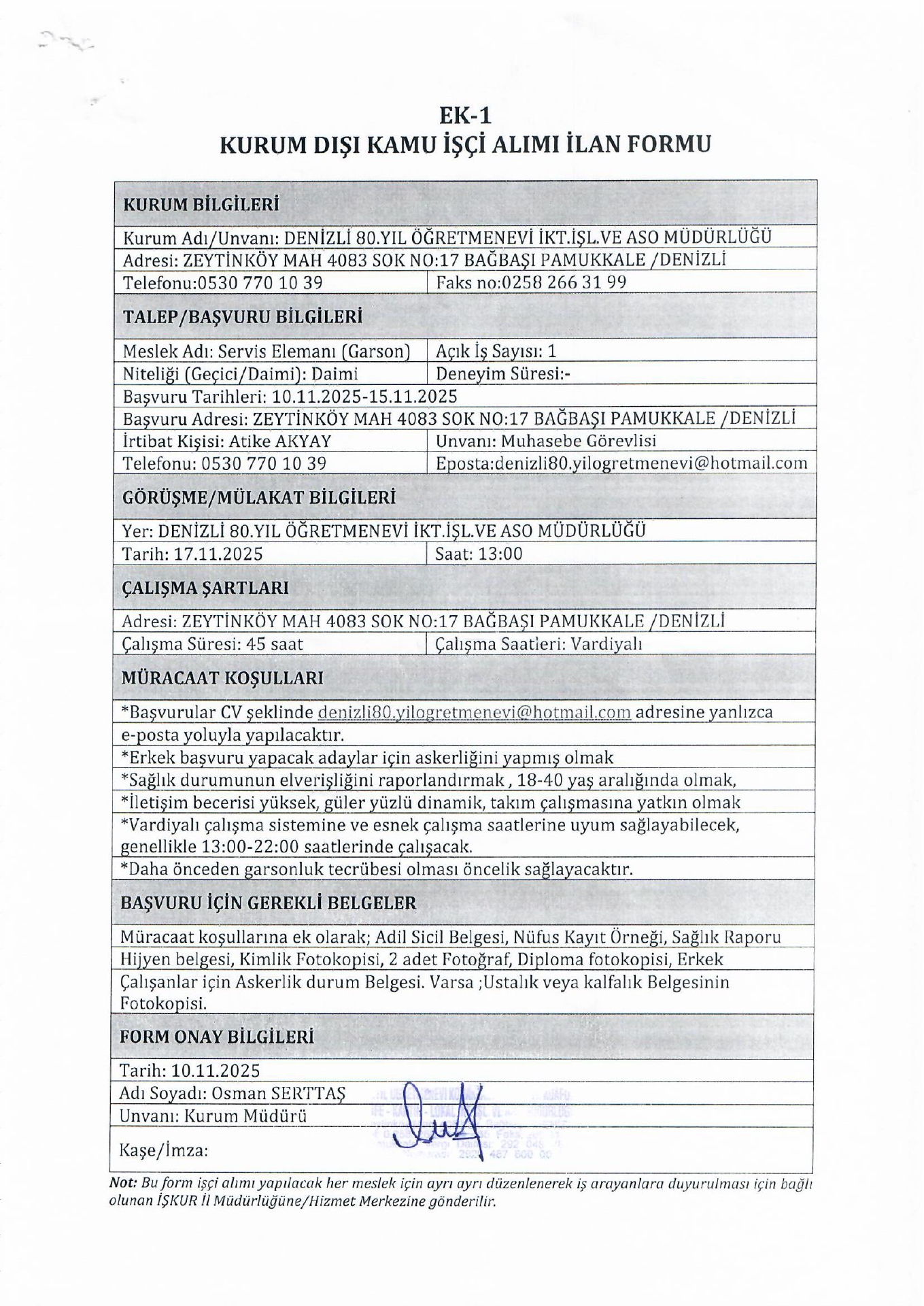 Ana sayfaDaimi İşçi İlanları Denizli 80 Yıl Öğretmenevi 1 İşçi Alacak Denizli 80 Yıl Öğretmenevi 1 İşçi Alacak. Son başvuru tarihi 15 Kasım 2025 Kaynak : İşkur İlan Giriş : 10 Kasım 2025 23:56, Son Güncelleme : 11 Kasım 2025 01:38 Yazdır Yorumlar (0) Abone Ol
