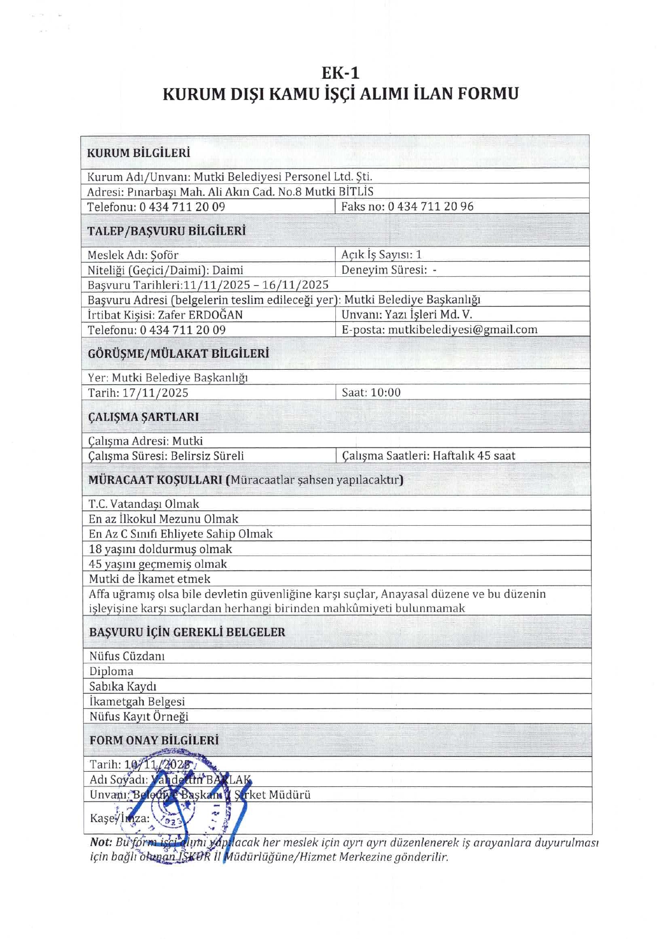 Ana sayfaDaimi İşçi İlanları Bitlis Mutki Belediyesi 1 İşçi Alacak ...Bitlis Mutki Belediyesi 1 İşçi Alacak. Son başvuru tarihi 16 Kasım 2025 Kaynak : İşkur İlan Giriş : 11 Kasım 2025 23:49, Son Güncelleme : 11 Kasım 2025 23:50 Yazdır Yorumlar (0) Abone Ol