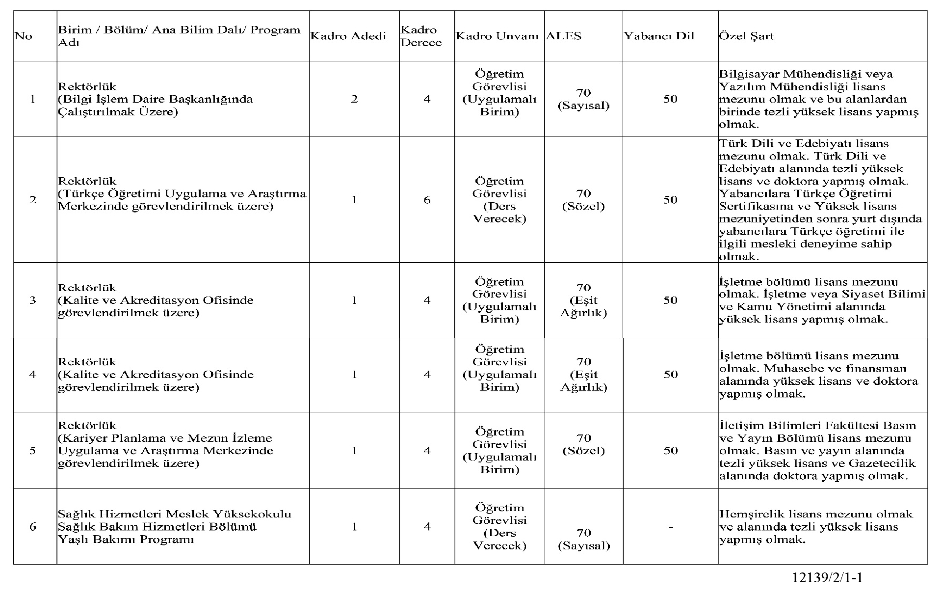 Üniversitemizin aşağıda belirlenen birimlerine. Öğretim Üyesi Dışındaki Öğretim Elemanı Kadrolarına Yapılacak Atamalarda Uygulanacak Merkezi Sınav ile Giriş Sınavlarına İlişkin Usul ve Esaslar Hakkında Yönetmelik, 2547 Sayılı Kanunun 31'inci maddesi ve 657 Sayılı Devlet Memurları Kanununun 48'inci Maddesine göre öğretim elemanı alımı yapılacaktır. Duyurulur.