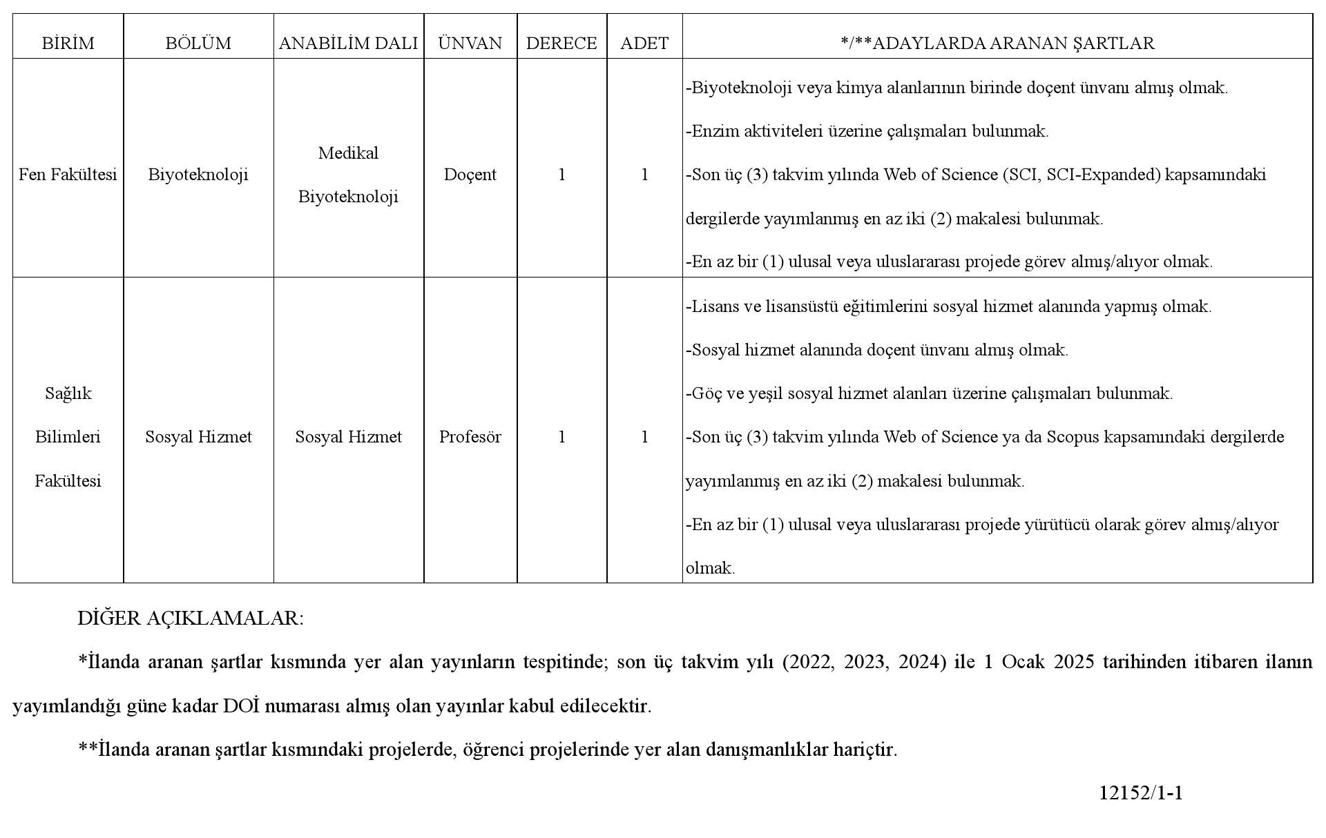 *İlanda aranan şartlar kısmında yer alan yayınların tespitinde; son üç takvim yılı (2022, 2023, 2024) ile 1 Ocak 2025 tarihinden itibaren ilanın yayımlandığı güne kadar DOİ numarası almış olan yayınlar kabul edilecektir.