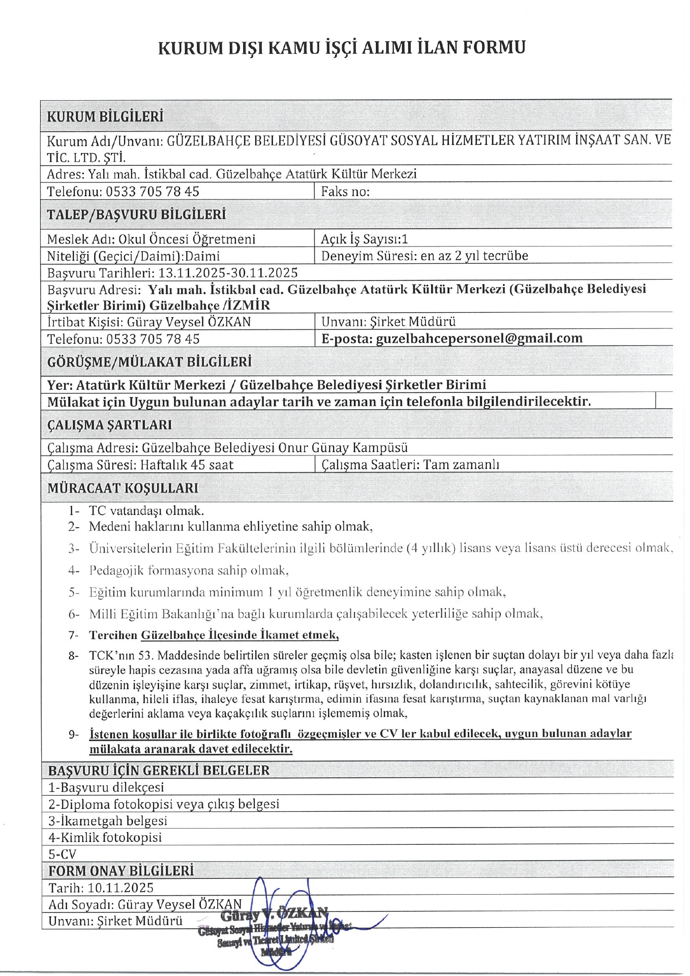 Ana sayfaDaimi İşçi İlanları İzmir Güzelbahçe Belediyesi 1 İşçi Alacak İzmir Güzelbahçe Belediyesi 1 İşçi Alacak. Son başvuru tarihi 30 Kasım 2025 Kaynak : İşkur İlan Giriş : 12 Kasım 2025 23:22, Son Güncelleme : 12 Kasım 2025 23:58 Yazdır Yorumlar (0) Abone Ol