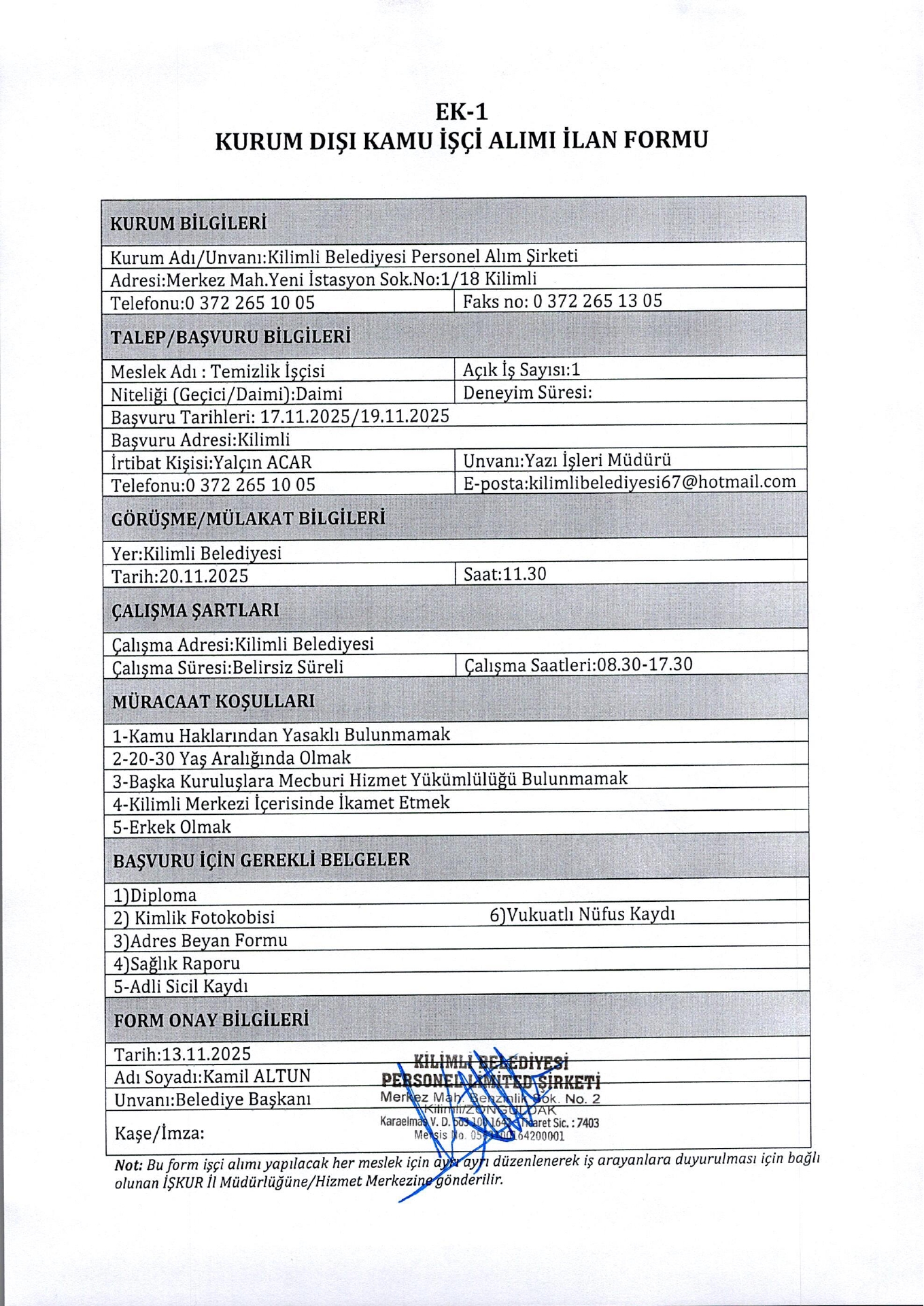 Zonguldak Kilimli Belediyesi 1 İşçi Alacak. Son başvuru tarihi 19 Kasım 2025