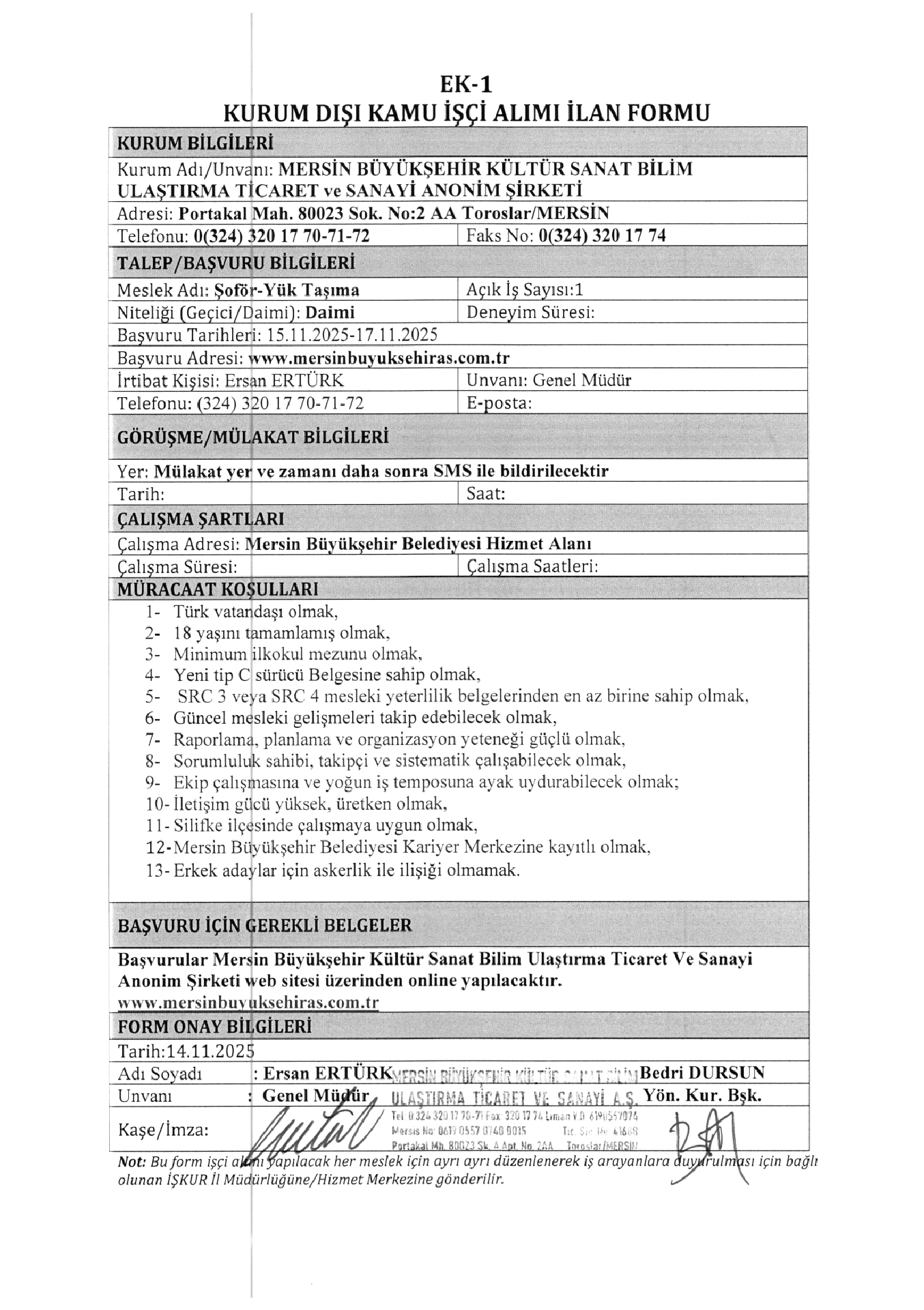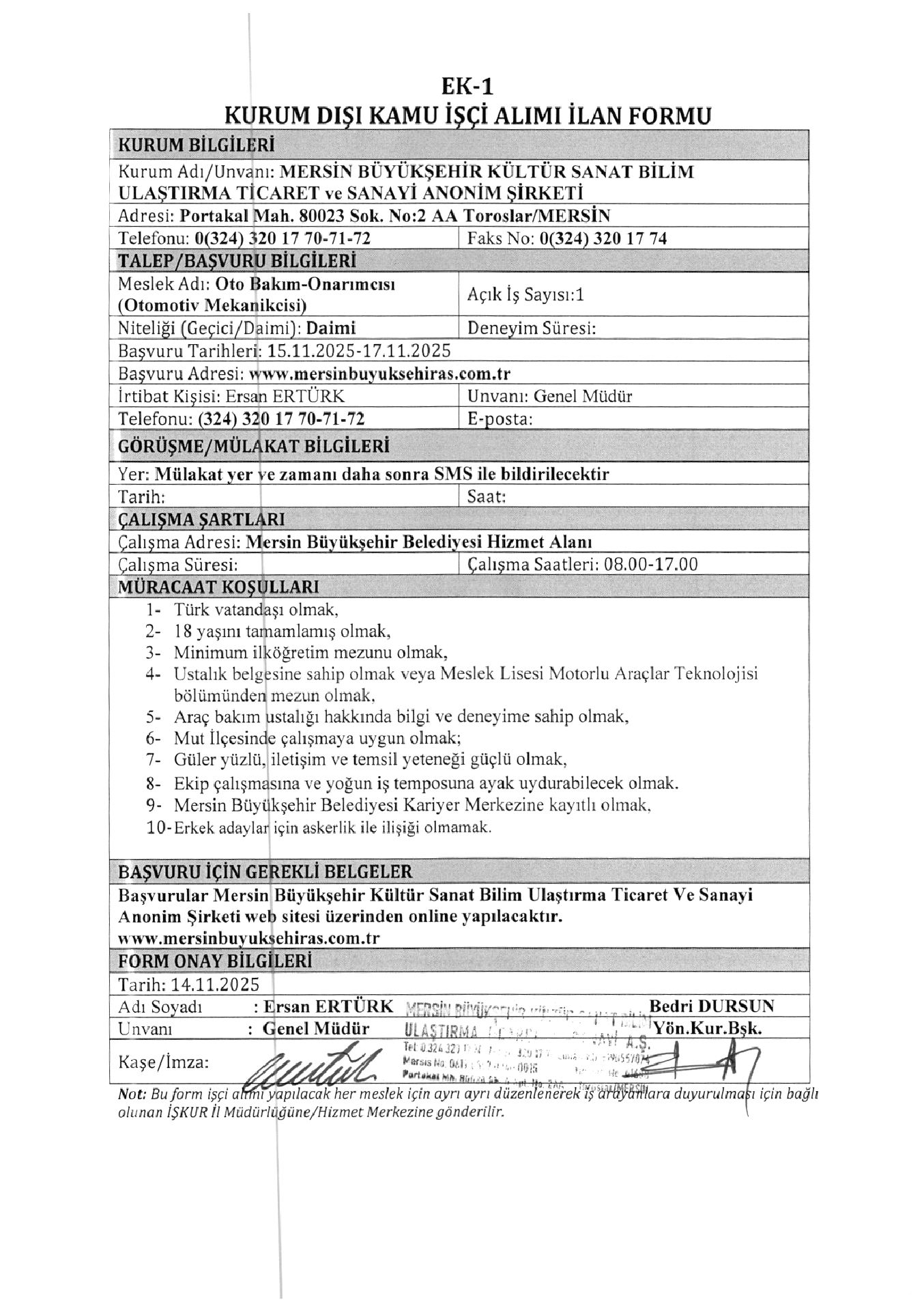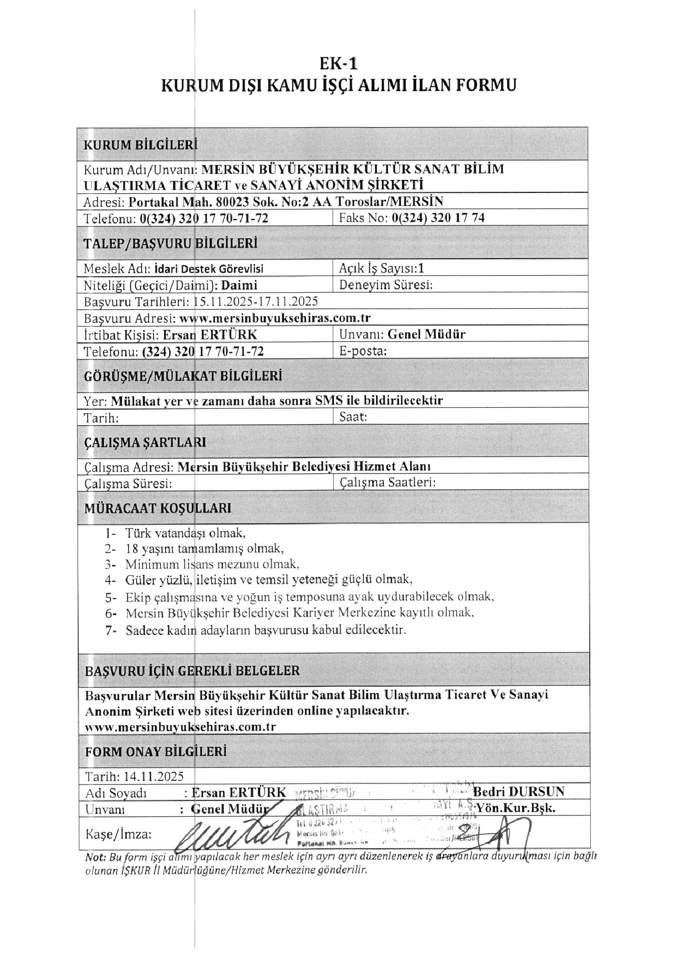 Ana sayfaDaimi İşçi İlanları Mersin Büyükşehir Belediyesi 3 İşçi Alacak Mersin Büyükşehir Belediyesi 3 İşçi Alacak. Son başvuru tarihi 17 Kasım 2025 Kaynak : İşkur İlan Giriş : 15 Kasım 2025 00:36, Son Güncelleme : 15 Kasım 2025 01:14 Yazdır Yorumlar (0) Abone Ol