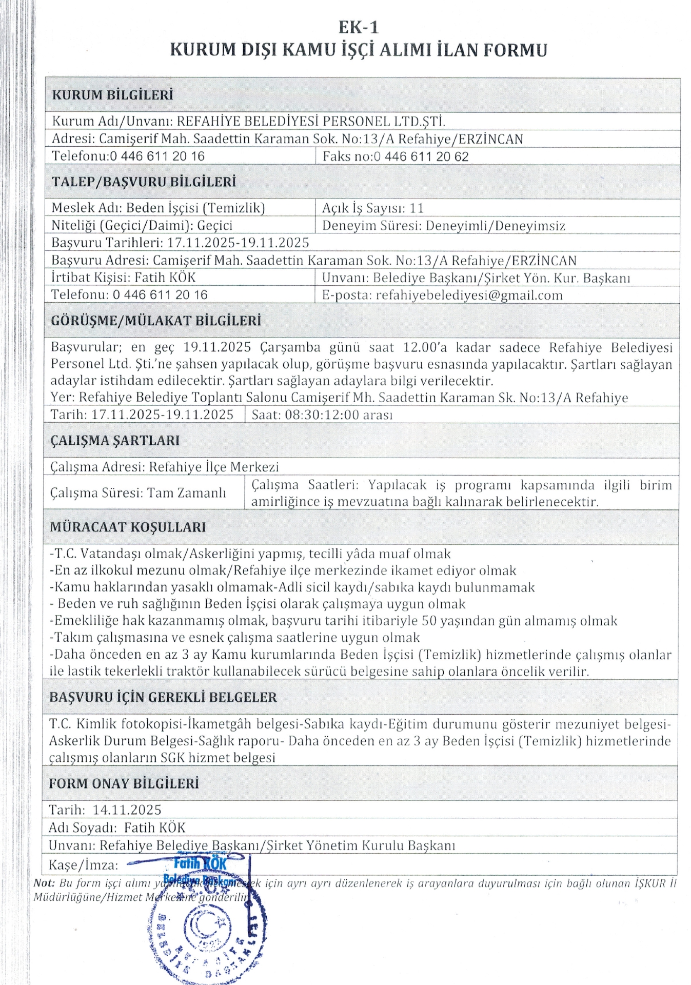 Ana sayfaGeçici İşçi İlanları Erzincan Refahiye Belediyesi Geçici 11 İşçi Alacak Erzincan Refahiye Belediyesi Geçici 11 İşçi Alacak. Son başvuru tarihi 19 Kasım 2025 Kaynak : İşkur İlan Giriş : 15 Kasım 2025 00:46, Son Güncelleme : 15 Kasım 2025 01:11 Yazdır Yorumlar (0) Abone Ol