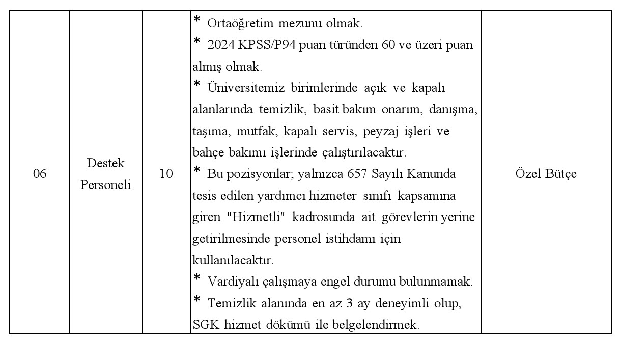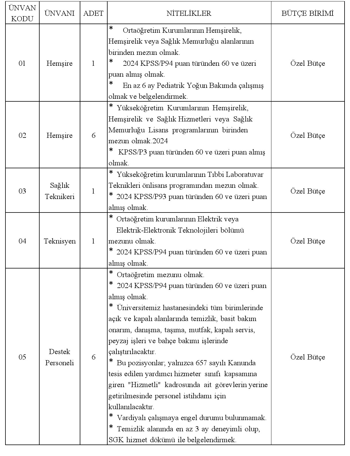 Üniversitemiz birimlerinde (Rektörlük, Fakülteler, Yüksekokullar, Enstitüler, Hastane, Merkez Müdürlükleri vb.) istihdam edilmek üzere (giderleri özel bütçeden karşılanacaktır.) 657 sayılı Devlet Memurları Kanununun 4. maddesinin (B) fıkrası ile 06.06.1978 tarihli ve 7/15754 sayılı Bakanlar Kurulu Kararı ile yürürlüğe konulan Sözleşmeli Personel Çalıştırılmasına İlişkin Esaslarda yer alan Ek 2. maddenin (b) fıkrasına göre 2024 KPSS (B) grubu puan sıralaması esas alınmak suretiyle aşağıda belirtilen pozisyonlara 25 ADET sözleşmeli personel alınacaktır.