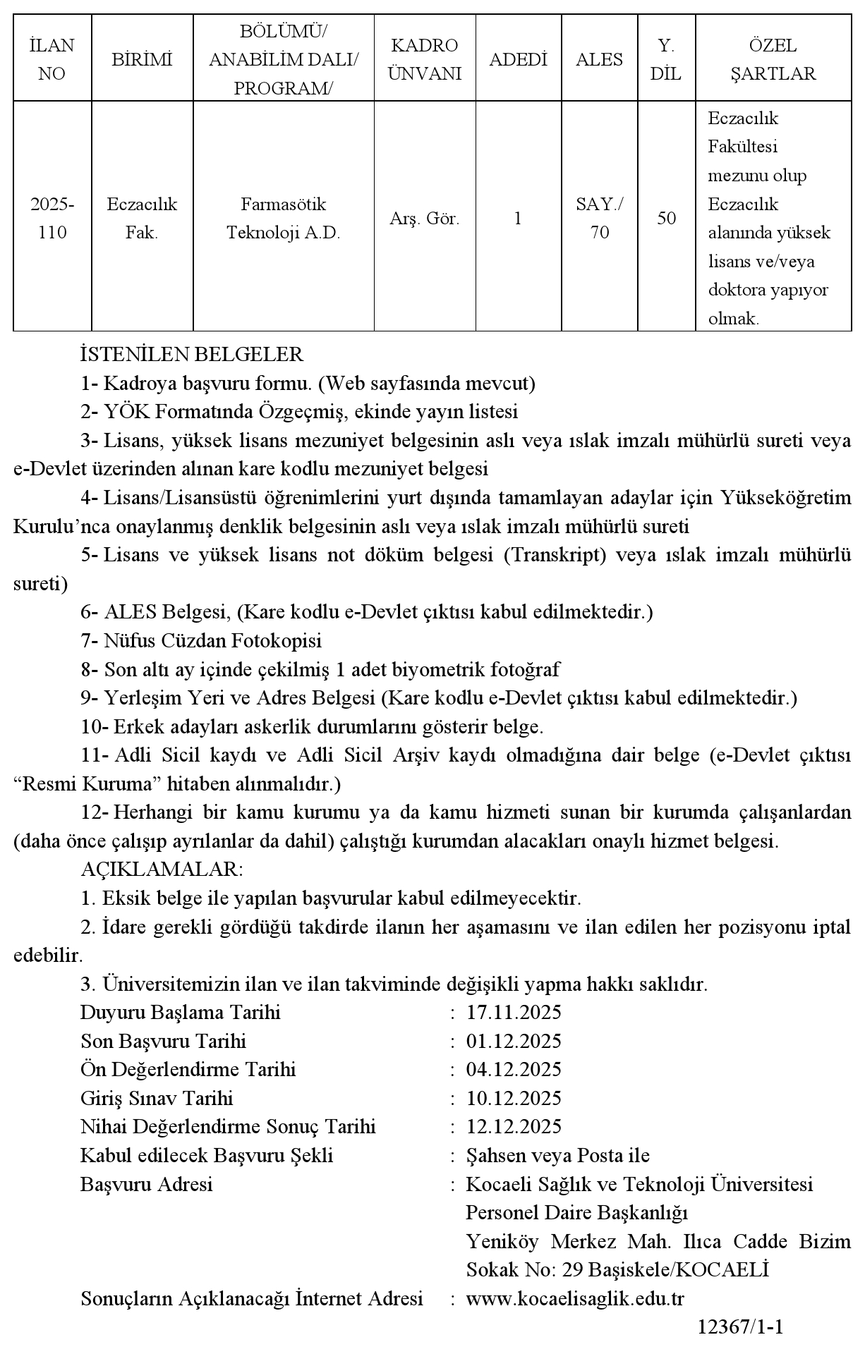 Üniversitemizin aşağıda belirtilen birimlerine 2547 sayılı Yükseköğretim Kanununun ilgili maddeleri, "Öğretim Üyeliğine Yükseltilme ve Atanma Yönetmeliği" ile "Kocaeli Sağlık ve Teknoloji Üniversitesi Öğretim Üyeliğine Yükseltilme ve Atama Kriterleri Yönergesi" hükümleri uyarınca aylık ve özlük hakları yönünden 4857 sayılı İş Kanunu hükümlerine tabi sözleşmeli statüde tam zamanlı öğretim elemanı alınacaktır. İlan edilen kadrolara müracaat edecek adayların 657 Sayılı Devlet Memurları Kanunu'nun 48 inci maddesindeki genel şartlar ile ilgili Kanun ve Yönetmelikte belirtilen koşulları sağlamış olmaları ve aşağıda belirtilen belgelerle birlikte şahsen ilanda belirtilen adrese başvurmaları gerekmektedir.