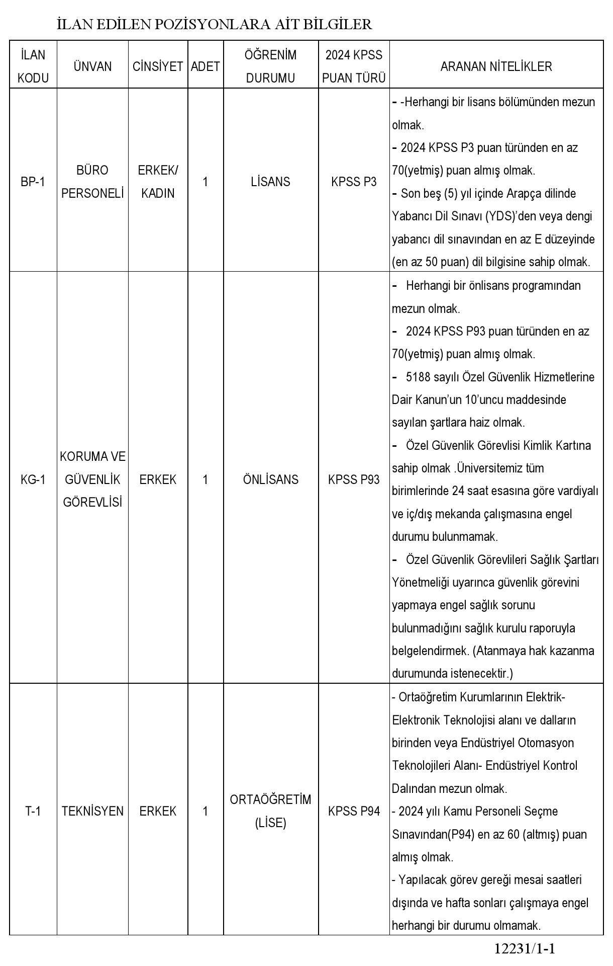 Üniversitemizin Birimlerinde istihdam edilmek üzere, 657 sayılı Devlet Memurları Kanunu'nun 4. Maddesinin (B) fıkrasına göre 06.06.1978 tarihli ve 7/15754 sayılı Kararnameye ekli 28.06.2007 tarih ve 26566 sayılı Resmi Gazete'de yayımlanan Sözleşmeli Personel Çalıştırılmasına İlişkin Esaslarda Değişiklik Yapılmasına Dair Esaslar' ın Ek 2. maddenin (b) fıkrasına uyarınca ilgili kadronun karşısında belirtilen asgari KPSS puanına sahip adaylar arasından, en yüksek puan sırası esas alınmak suretiyle sözleşmeli (4/B) Büro Personeli, Koruma ve Güvenlik Görevlisi ile Teknisyen alımı yapılacaktır.