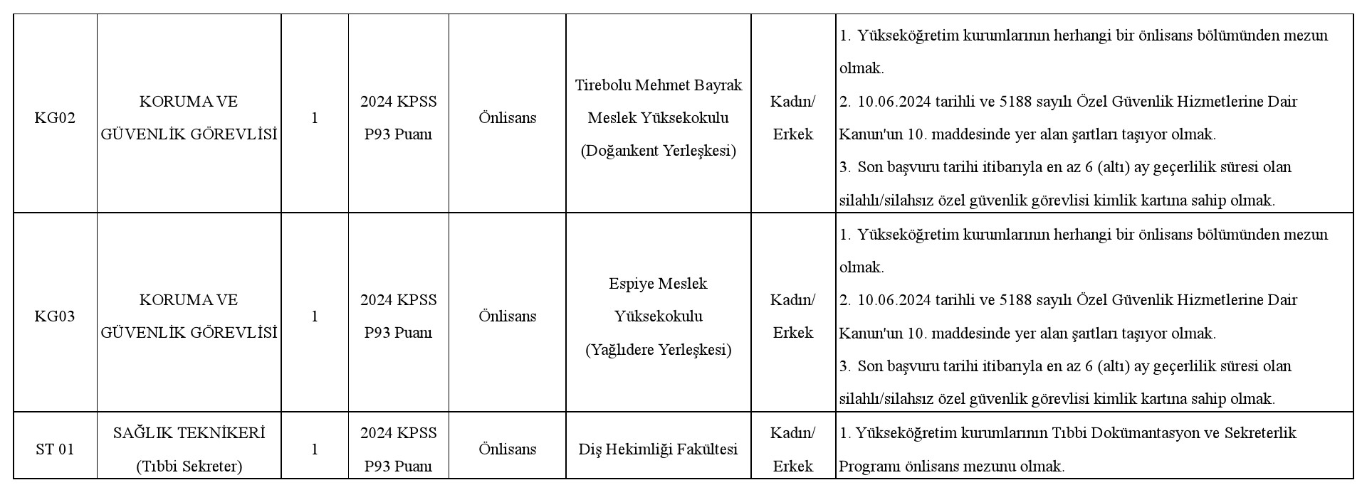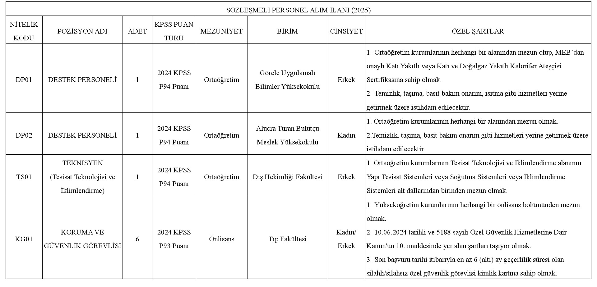 Üniversitemizde 657 sayılı Devlet Memurları Kanunu'nun 4'üncü maddesinin (B) fıkrasına göre Sözleşmeli Personel olarak istihdam edilmek üzere 06.06.1978 tarihli ve 7/15754 sayılı Bakanlar Kurulu Kararı ile yürürlüğe konulan Sözleşmeli Personel Çalıştırılmasına İlişkin Esaslar uyarınca Ortaöğretim mezunları için 2024 KPSS (B) grubu KPSSP94 puanı, Ön lisans mezunları için 2024 KPSS (B) grubu KPSSP93 puanı esas alınmak suretiyle aşağıdaki tabloda belirtilen unvanlarda sözleşmeli personel alınacaktır. Ayrıca sözlü sınav yapılmayacaktır.