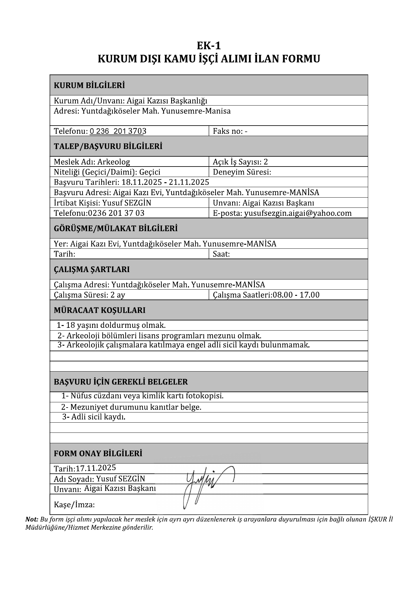 Ana sayfaGeçici İşçi İlanları Manisa Aigai Kazısı Geçici 2 İşçi Alacak Manisa Aigai Kazısı Geçici 2 İşçi Alacak. Son başvuru tarihi 21 Kasım 2025 Kaynak : İşkur İlan Giriş : 17 Kasım 2025 23:02, Son Güncelleme : 18 Kasım 2025 00:27 Yazdır Yorumlar (0) Abone Ol
