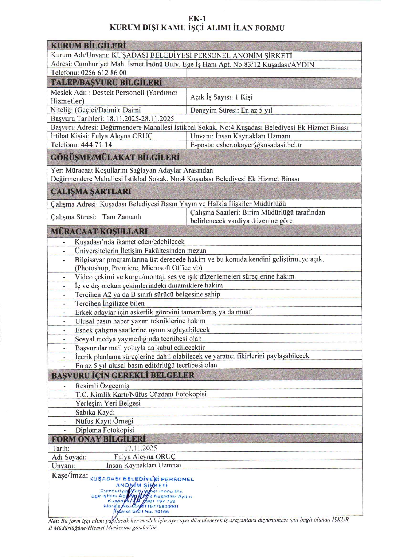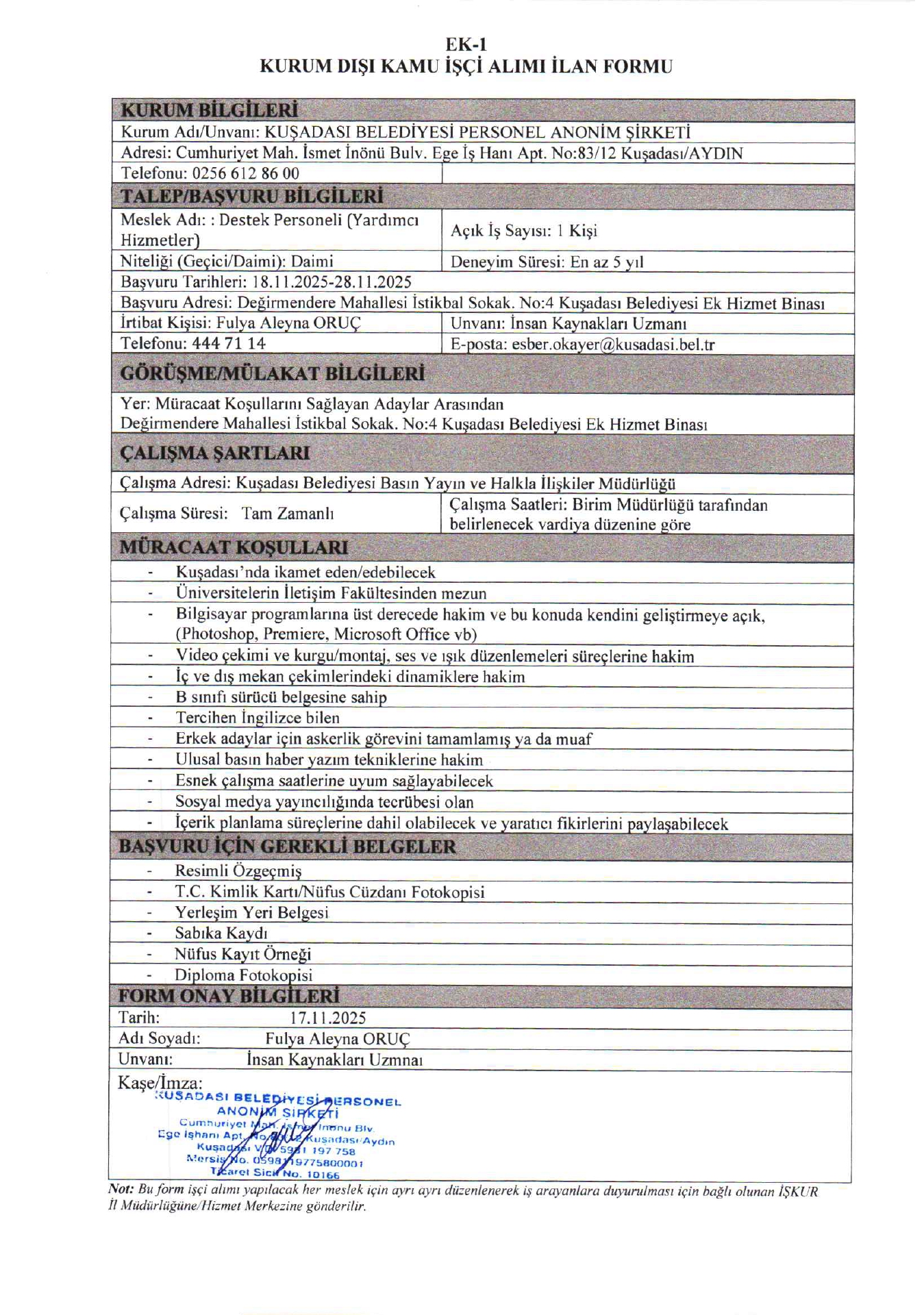 Ana sayfaDaimi İşçi İlanları Aydın Kuşadası Belediyesi 2 İşçi Alacak Aydın Kuşadası Belediyesi 2 İşçi Alacak. Son başvuru tarihi 28 Kasım 2025 Kaynak : İşkur İlan Giriş : 17 Kasım 2025 23:05, Son Güncelleme : 18 Kasım 2025 00:27 Yazdır Yorumlar (0) Abone Ol