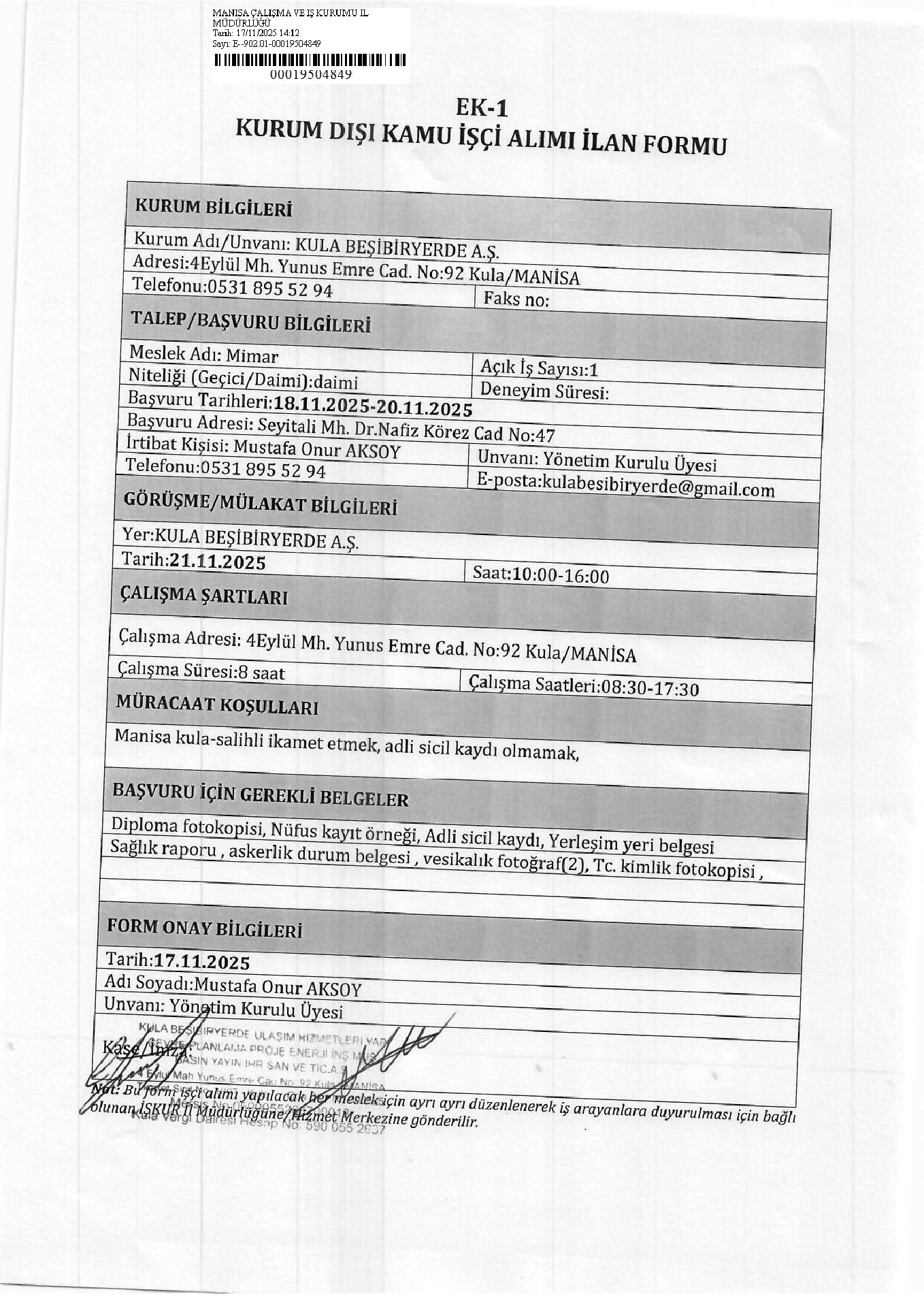 Ana sayfaDaimi İşçi İlanları Manisa Kula Beşibiryerde AŞ. 1 İşçi Alacak Manisa Kula Beşibiryerde AŞ. 1 İşçi Alacak. Son başvuru tarihi 20 Kasım 2025 Kaynak : İşkur İlan Giriş : 17 Kasım 2025 23:08, Son Güncelleme : 18 Kasım 2025 00:26 Yazdır Yorumlar (0) Abone Ol
