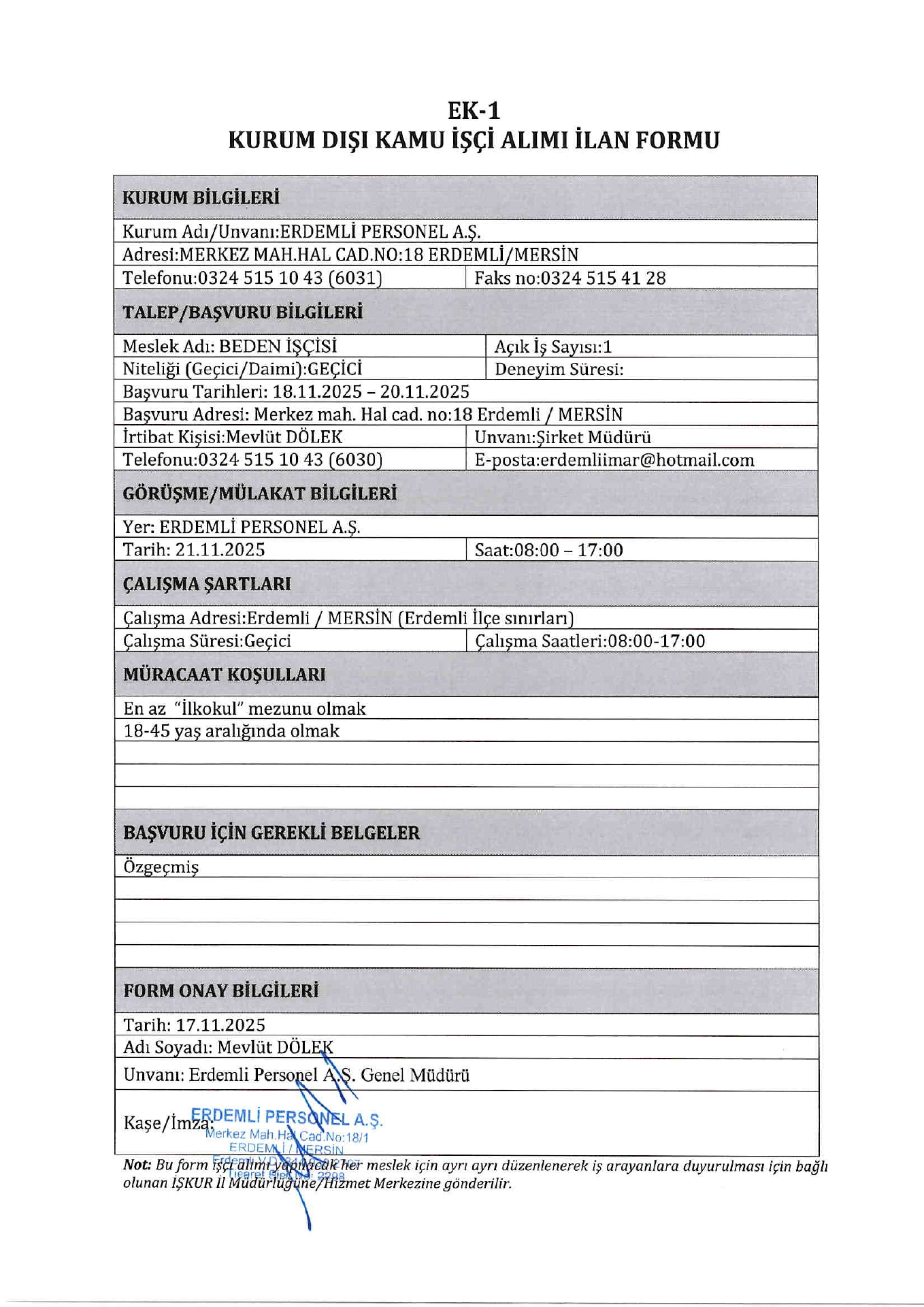 Ana sayfaGeçici İşçi İlanları Mersin Erdemli Personel AŞ. Geçici 1 İşçi Alacak Mersin Erdemli Personel AŞ. Geçici 1 İşçi Alacak. Son başvuru tarihi 20 Kasım 2025 Kaynak : İşkur İlan Giriş : 17 Kasım 2025 23:18, Son Güncelleme : 18 Kasım 2025 00:23 Yazdır Yorumlar (0) Abone Ol