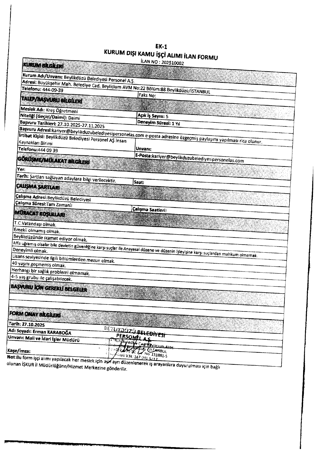 Ana sayfaDaimi İşçi İlanları İstanbul Beylikdüzü Belediyesi 5 İşçi Alacak İstanbul Beylikdüzü Belediyesi 5 İşçi Alacak. Son başvuru tarihi 27 Kasım 2025 Kaynak : İşkur İlan Giriş : 17 Kasım 2025 23:24, Son Güncelleme : 18 Kasım 2025 00:22 Yazdır Yorumlar (0) Abone Ol
