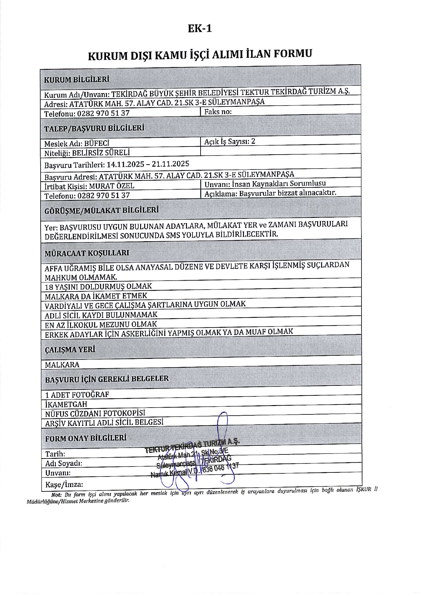 Ana sayfaDaimi İşçi İlanları Tekirdağ Büyükşehir Belediyesi 2 İşçi Alacak Tekirdağ Büyükşehir Belediyesi 2 İşçi Alacak. Son başvuru tarihi 21 Kasım 2025 Kaynak : İşkur İlan Giriş : 17 Kasım 2025 23:40, Son Güncelleme : 18 Kasım 2025 00:17 Yazdır Yorumlar (0) Abone Ol