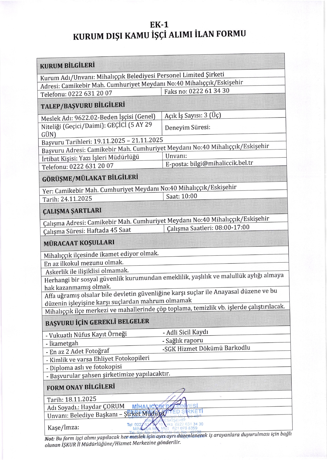 Ana sayfaGeçici İşçi İlanları Eskişehir Mihalıççık Belediyesi Geçici 3 İşçi Alacak Eskişehir Mihalıççık Belediyesi Geçici 3 İşçi Alacak. Son başvuru tarihi 21 Kasım 2025 Kaynak : İşkur İlan Giriş : 18 Kasım 2025 22:54, Son Güncelleme : 19 Kasım 2025 00:18 Yazdır Yorumlar (0) Abone Ol