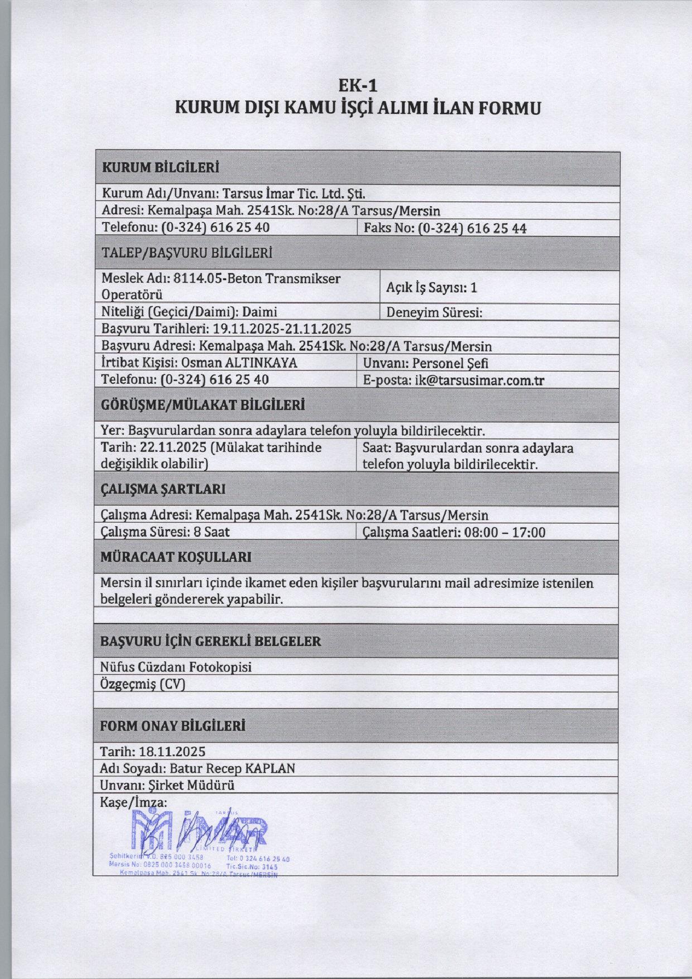 Ana sayfaDaimi İşçi İlanları Mersin Tarsus İmar 1 İşçi Alacak Mersin Tarsus İmar 1 İşçi Alacak. Son başvuru tarihi 21 Kasım 2025 Kaynak : İşkur İlan Giriş : 18 Kasım 2025 23:06, Son Güncelleme : 19 Kasım 2025 00:15 Yazdır Yorumlar (0) Abone Ol