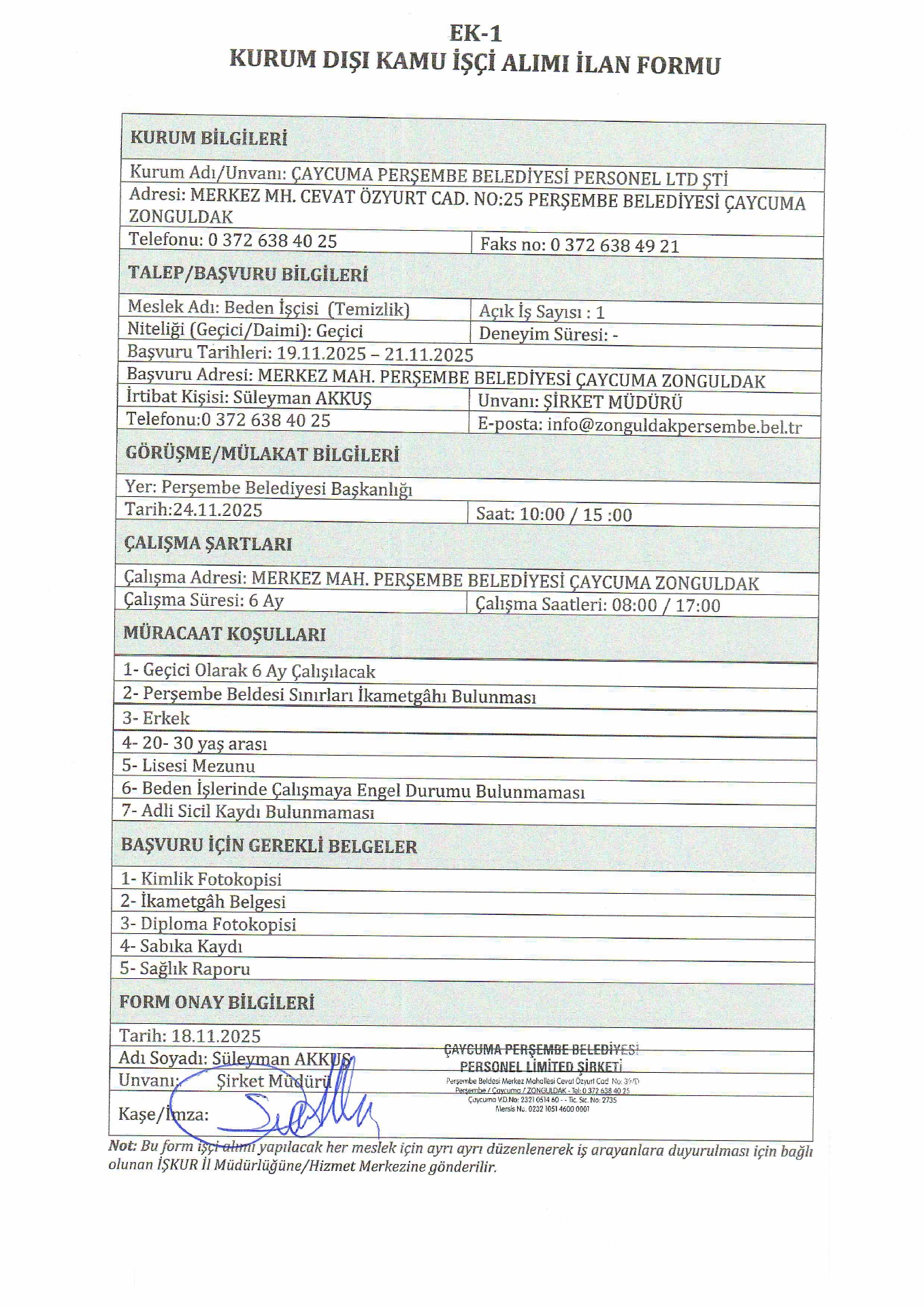 Zonguldak Çaycuma Perşembe Belediyesi Geçici 1 İşçi Alacak. Son başvuru tarihi 21 Kasım 2025