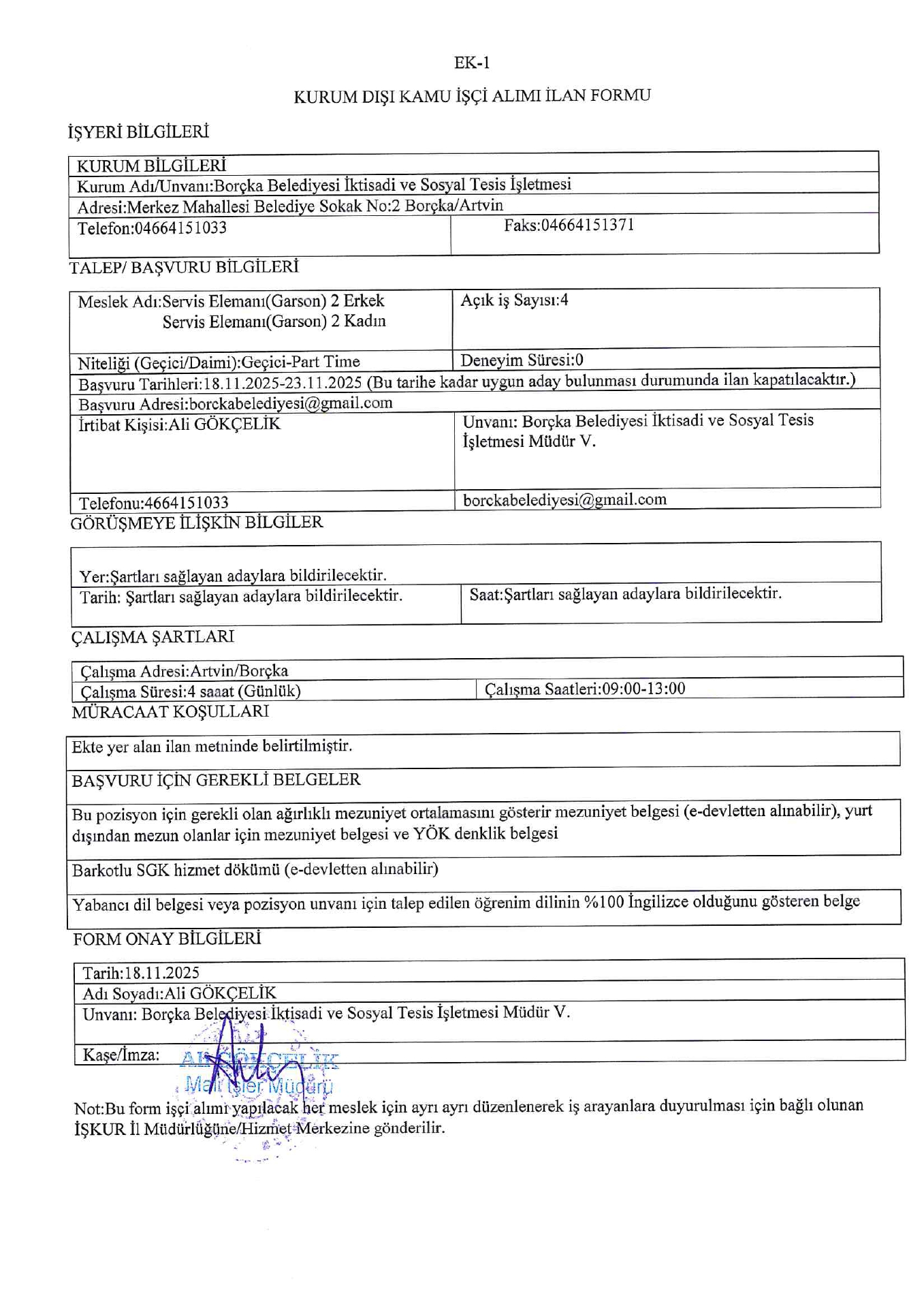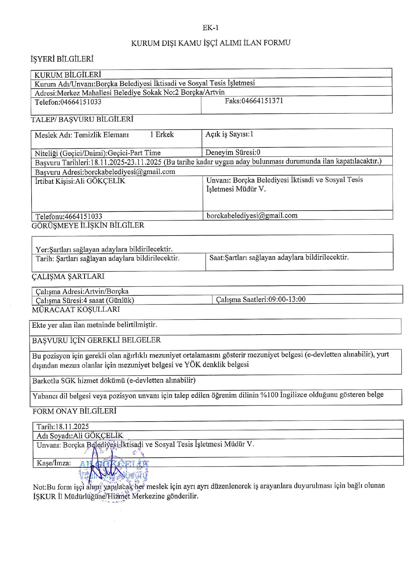 Ana sayfaGeçici İşçi İlanları Artvin Borçka Belediyesi Geçici 5 İşçi Alacak Artvin Borçka Belediyesi Geçici 5 İşçi Alacak. Son başvuru tarihi 23 Kasım 2025 Kaynak : İşkur İlan Giriş : 18 Kasım 2025 23:16, Son Güncelleme : 19 Kasım 2025 00:13 Yazdır Yorumlar (0) Abone Ol