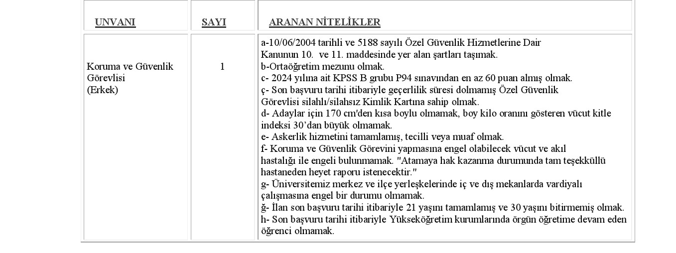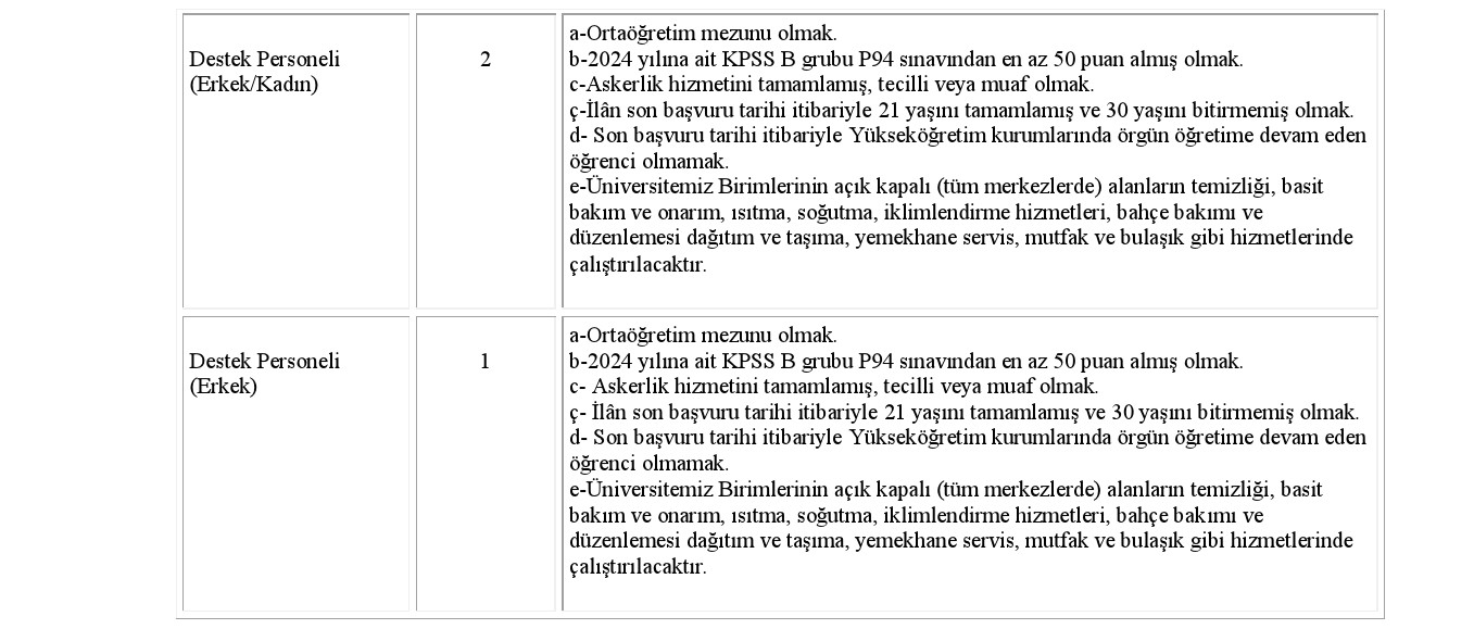 Üniversitemiz Rektörlüğüne bağlı birimlerde 657 sayılı Devlet Memurları Kanununun 4'üncü maddesinin (B) fıkrasına göre istihdam edilmek ve giderleri özel bütçeden karşılanmak üzere; "Sözleşmeli Personel Çalıştırılmasına İlişkin Esaslar" uyarınca Ortaöğretim mezunları için 2024 KPSS (B) grubu KPSSP94 puanı esas alınmak suretiyle aşağıda belirtilen ünvanlarda 4 sözleşmeli personel alınacaktır. Ayrıca yazılı ve sözlü sınav yapılmayacaktır.