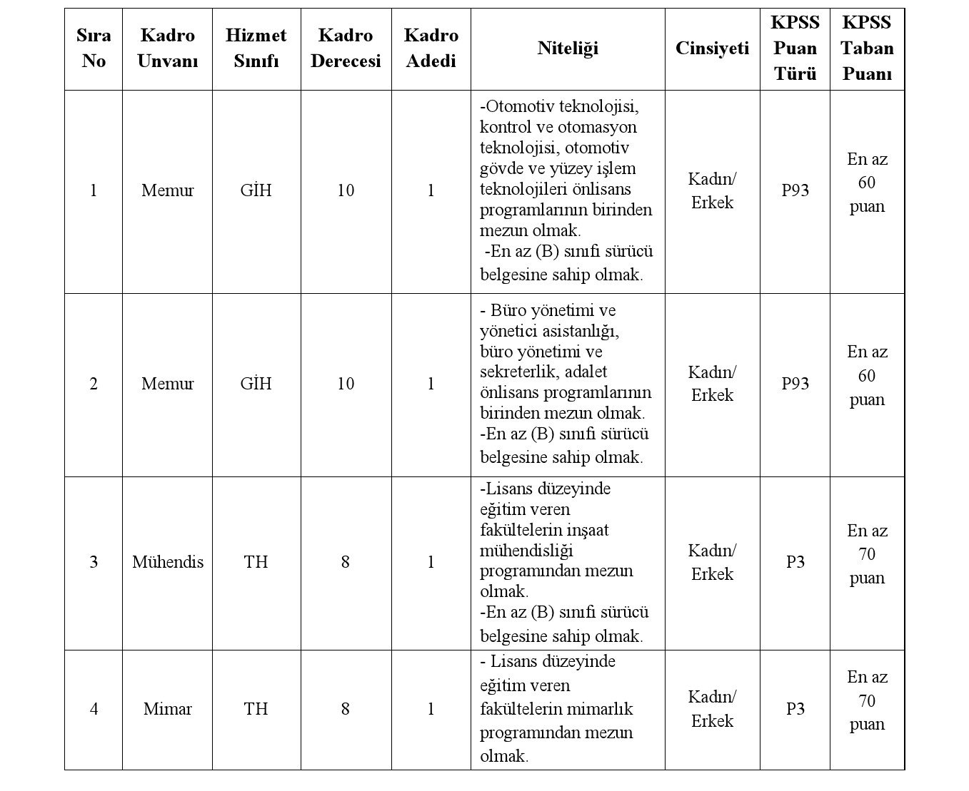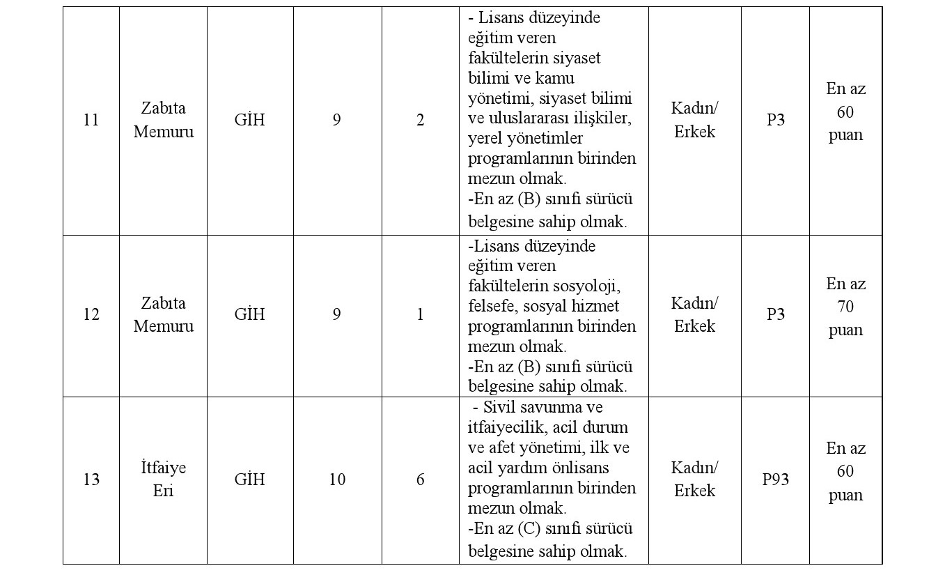 a) İlan edilen memur, zabıta memuru ve itfaiye eri kadroları için mezun olunan okul itibarıyla öğrenim şartlarını taşımak ve bu öğrenimle ilgili olarak 2024 yılı Kamu Personeli Seçme Sınavından (KPSS (B) grubu) alım yapılacak kadroların karşısındaki puan türünden, belirtilen asgari KPSS puanını almış olmak,