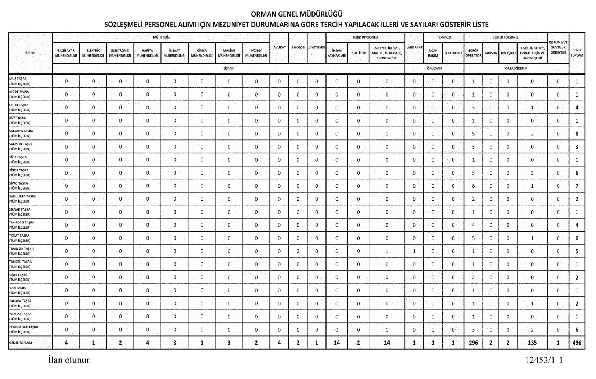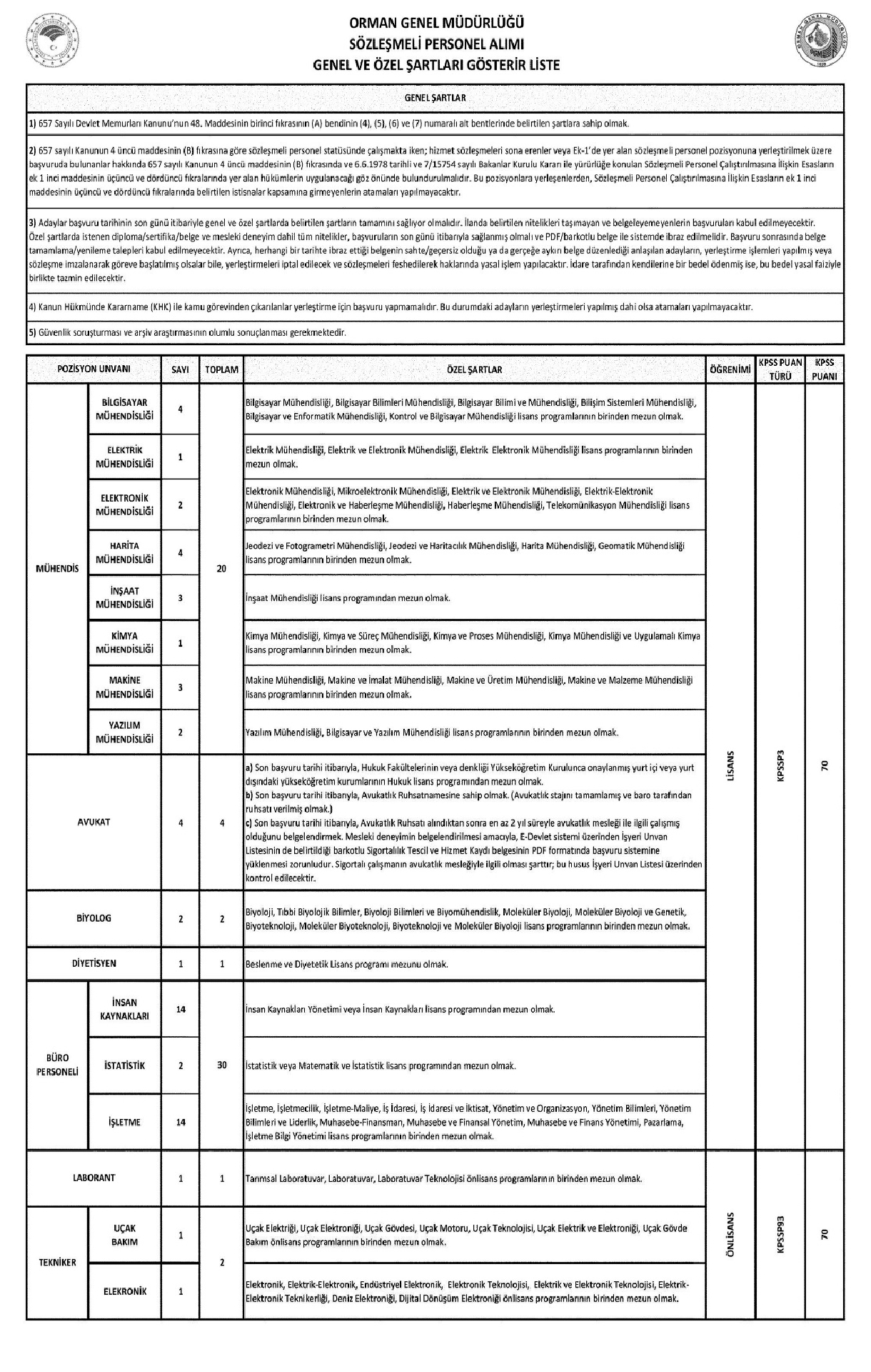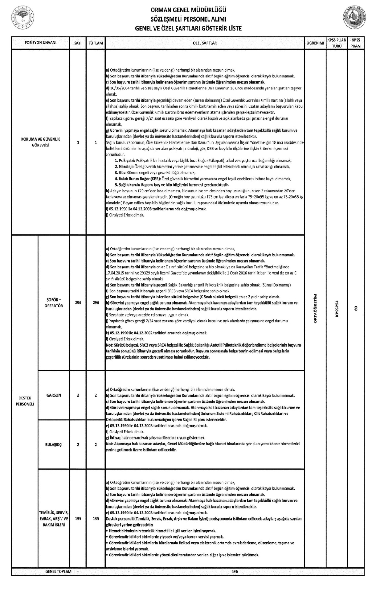 Genel Müdürlüğümüz merkez ve taşra birimlerinde 657 sayılı Devlet Memurları Kanunu'nun 4. maddesinin (B) fıkrasına göre istihdam edilmek üzere 06.06.1978 tarihli ve 7/15754 sayılı Kararnameye ekli 28.06.2007 tarihli ve 26566 sayılı Resmi Gazete'de yayımlanan Sözleşmeli Personel Çalıştırılmasına İlişkin Esaslarda Değişiklik Yapılmasına Dair Esaslar'da yer alan ek 2'nci maddenin (b) fıkrası gereğince "Yazılı ve/veya sözlü sınav yapılmaksızın, KPSS (B) grubu puan sıralaması esas alınmak suretiyle" Ek-1'de yer alan il ve pozisyonlara Ek-2'de belirtilen genel - özel şart ve mezuniyetlerden toplam 496 (dört yüz doksan altı) adet sözleşmeli personel alınacaktır.