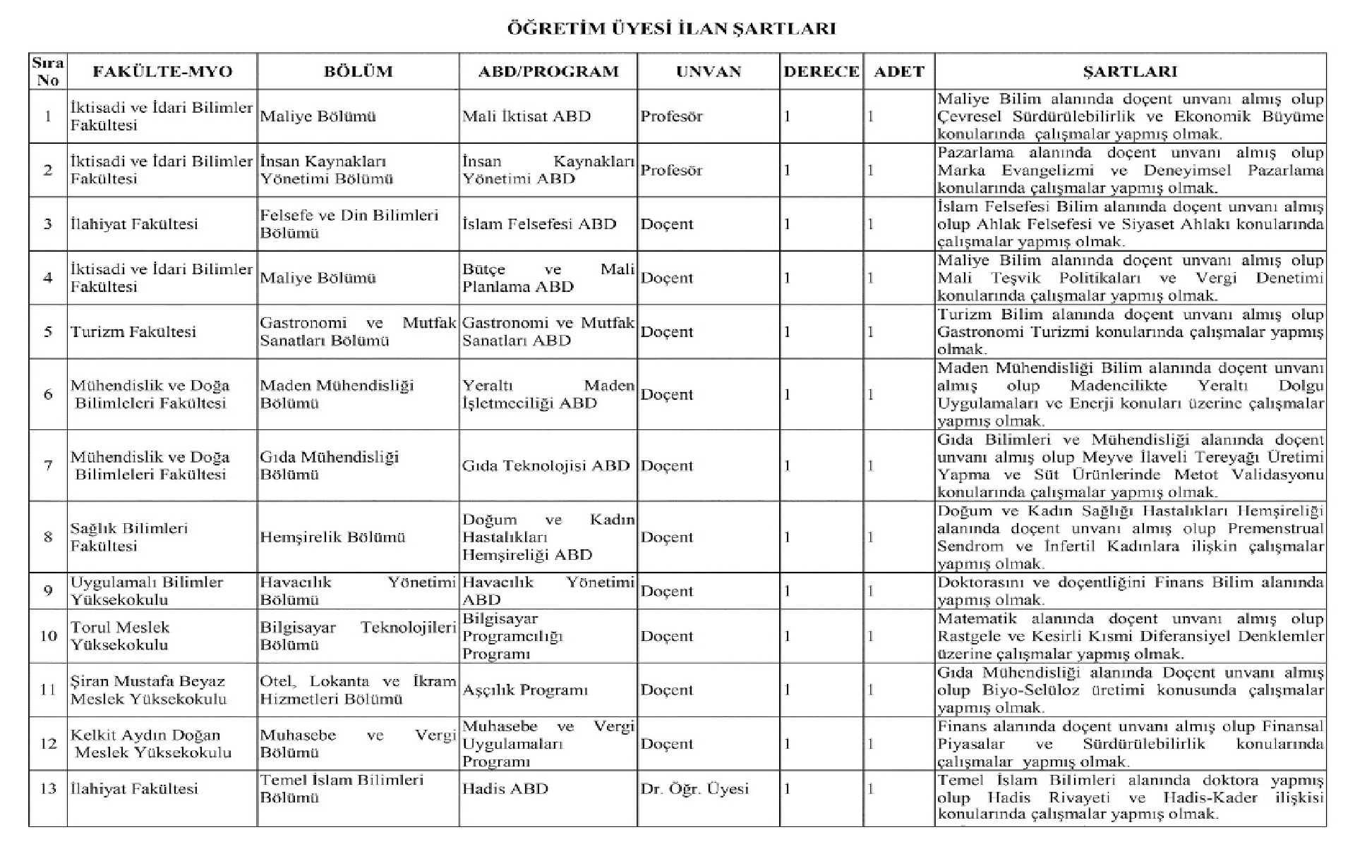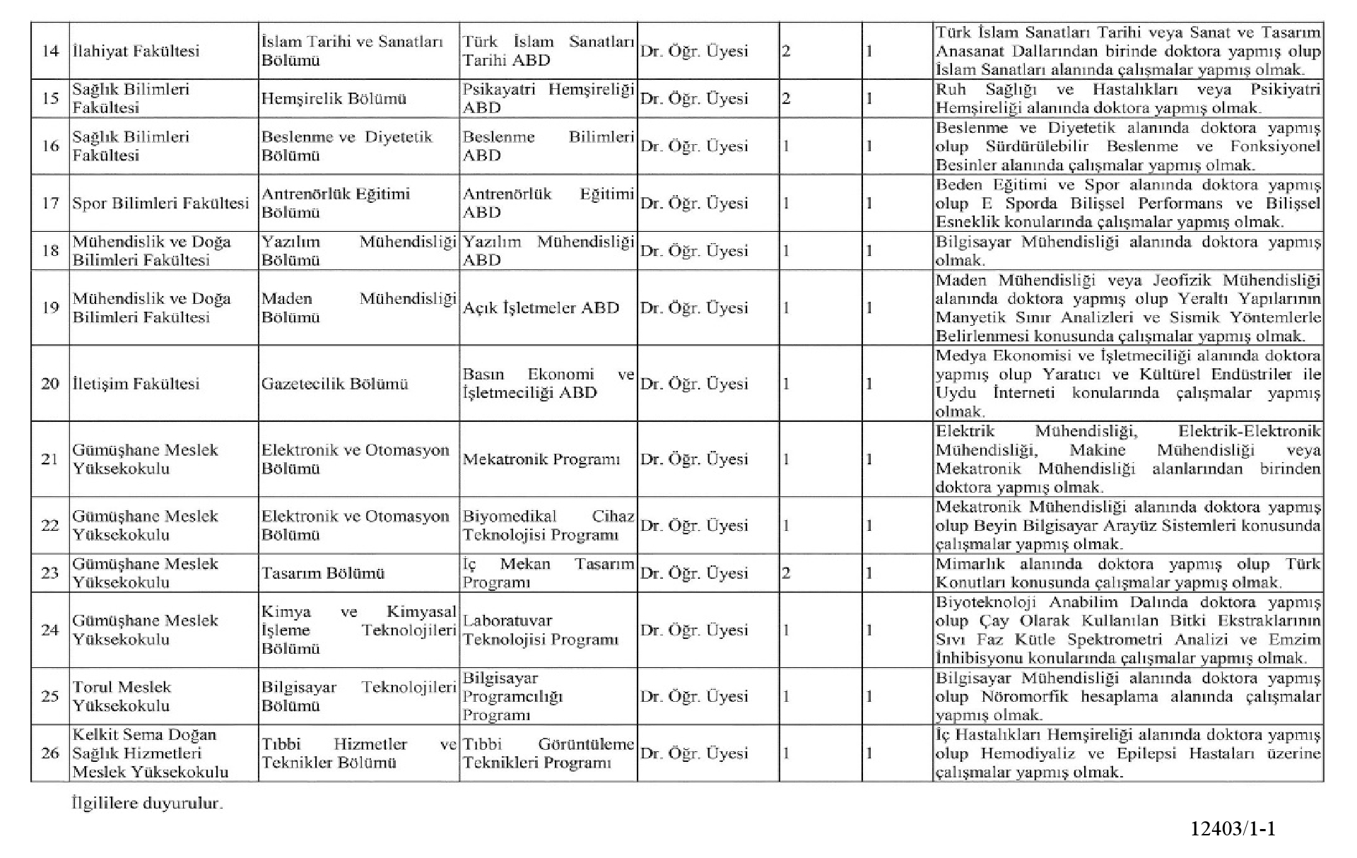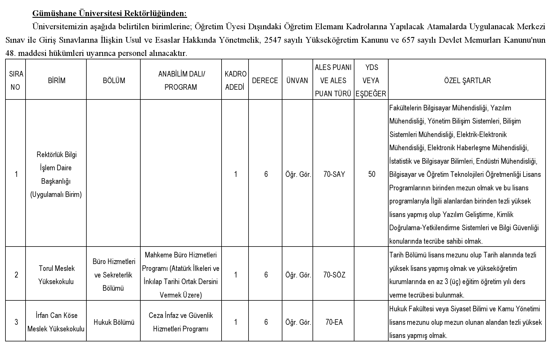 Üniversitemizin aşağıda belirtilen birimlerine 2547 Sayılı Kanunun ve Öğretim Üyeliğine Yükseltilme ve Atanma Yönetmeliğinin ilgili maddeleri uyarınca öğretim üyesi alınacaktır. Başvuracak adayların Üniversitemizin web sayfasında yayınlanan "Gümüşhane Üniversitesi Öğretim Üyeliğine Yükseltilme ve Atanma Yünergesi"nde belirtilen kriterleri taşımaları gerekmektedir. Ayrıca adayların fakültelerin veya 4 yıllık yüksekokulların ilgili bölümlerinden mezun olmaları (Yurt dışından alınan diplomalann denkliğinin Yükseköğretim Kurulu'nca onaylanmış olması şarttır.), 657 Sayılı Kanunun 48. maddesindeki genel ve özel şartları sağlamış olmaları gerekmektedir.