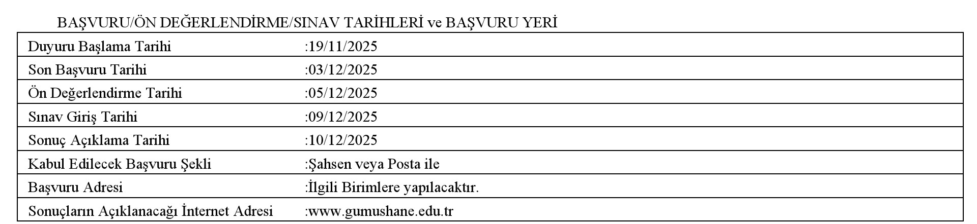 Not: Kadrolara başvuracak adaylar Gümüşhane Üniversitesi öğretim Üyeliğine Yükseltilme ve Atanma Yönergesindeki Atama Bilgi Formunu doldurmaları gerekmektedir. Adaylar başvuruda istenilen belgeleri Gümüşhane Üniversitesi Öğretim Üyeliğine Yükseltilme ve Atanma Yönergesinin 7. Maddesindeki istenilen belgeleri eksiksiz ve maddede belirtilen sekli ile eklemek zorundadırlar, ((hıtps: personel.gumushane.edu.tr tr sayfa İ%c3%a7-koııtrol.dok%c3%bcmanlar.formlar') adresinden temin edilecektir.)